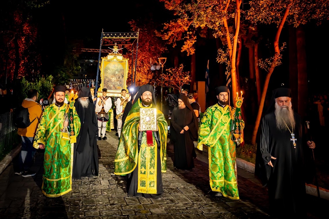 Ακολούθησε η λιτανευτική πομπή, με επικεφαλής την Εικόνα της Εξόδου, τον Σταυρό Ευλογίας του Επισκόπου Ρωγών και το Ιερό Λάβαρο, από τον Ιερό Μητροπολιτικό Ναό στον Κήπο των Ηρώων.