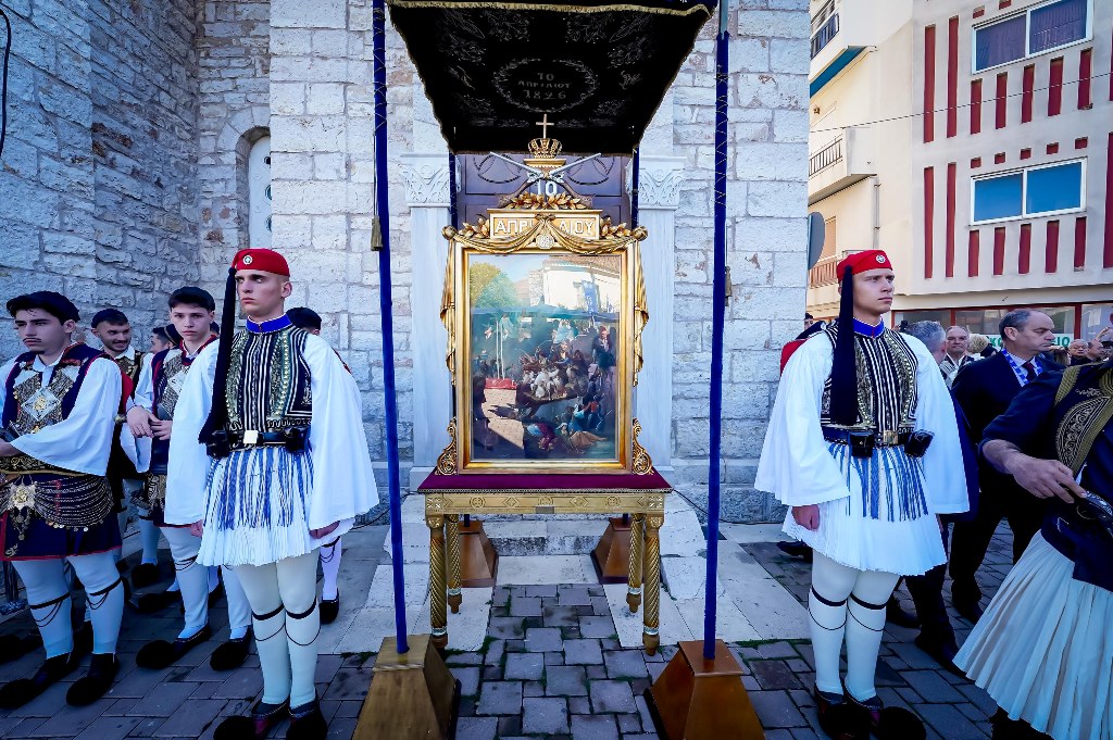 Ακολούθησαν η κατάθεση στεφάνου από τον Εξοχώτατο Πρόεδρο της Ελληνικής Δημοκρατίας κ. Κωνσταντίνο Τασούλα και η εκφώνηση του πανηγυρικού της ημέρας από τον Εξοχώτατο Πρωθυπουργό κ. Κυριάκο Μητσοτάκη, ενώ η υψίφωνος κα Βίβιαν Ντάγκλας απέδωσε το μοιρολόι «Να ζει το Μεσολόγγι».