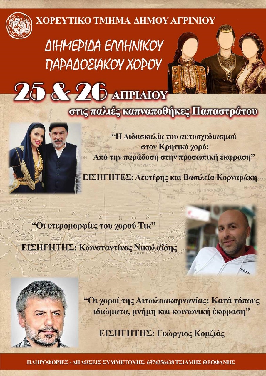 Με μεγάλη χαρά προσκαλείστε στην Διημερίδα Ελληνικού Παραδοσιακού Χορού που διοργανώνει το Χορευτικό Τμήμα Δήμου Αγρινίου, στις 25 & 26 Απριλίου, στις παλιές καπναποθήκες Παπαστράτου.