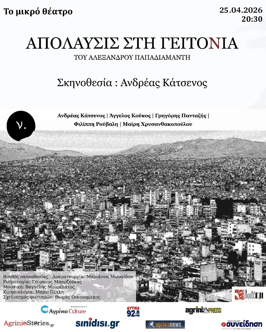 Το Μικρό Θέατρο στο Αγρίνιο, παρουσιάζει την θεατρική παράσταση «Απόλαυσις στη γειτονιά» του Αλέξανδρου Παπαδιαμάντη σε σκηνοθεσία του Ανδρέα Κάτσενου, το Σάββατο 25 Απριλίου στις 20:30 μ.μ.