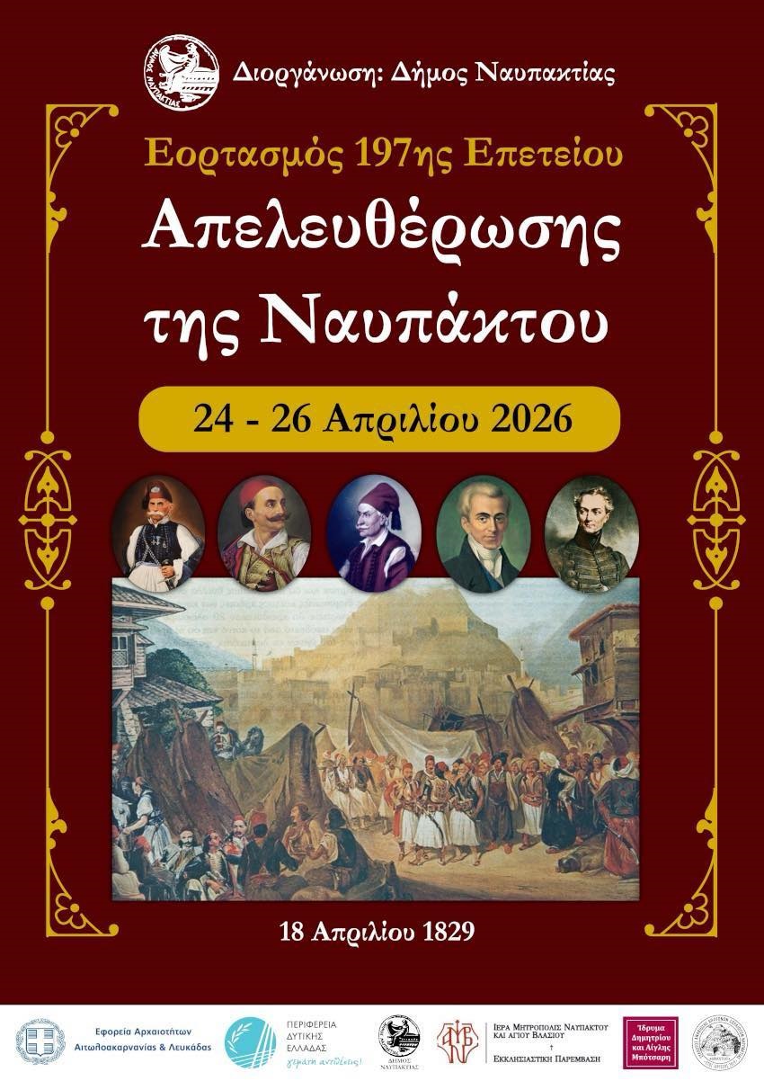 Ο Δήμος Ναυπακτίας εορτάζει με λαμπρότητα από τις 24 έως 26 Απριλίου 2026 την 197η Επέτειο της Απελευθέρωσης της Ναυπάκτου, με σειρά εκδηλώσεων που διοργανώνονται με την υποστήριξη της Ιεράς Μητρόπολης Ναυπάκτου και Αγίου Βλασίου, της Περιφέρειας Δυτικής Ελλάδος, της Εφορείας Αρχαιοτήτων Αιτωλοακαρνανίας και Λευκάδος, του Ιδρύματος Δημητρίου και Αίγλης Μπότσαρη και του Συλλόγου Αναβίωσης Απογόνων Σουλιωτών Ναυπακτίας «Έπαχτος».