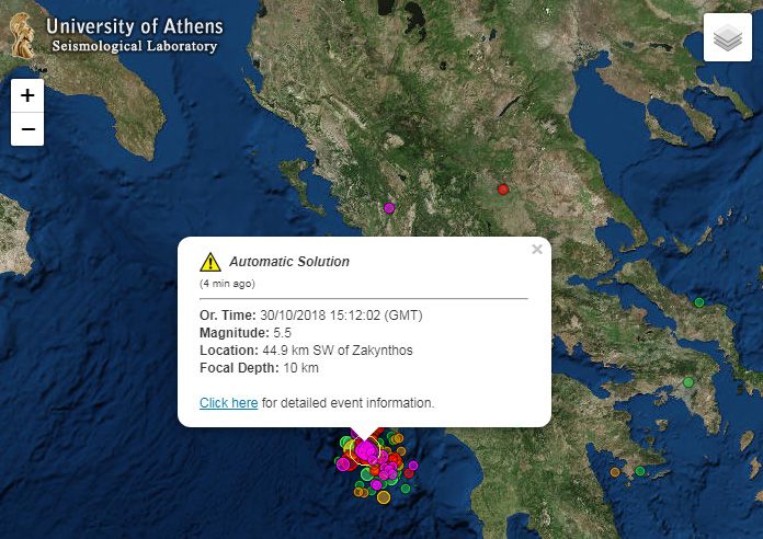 M 5.5, 30/10 17:12, βάθος 7 χλμ, 44 χλμ ΝΔ από Ζάκυνθος