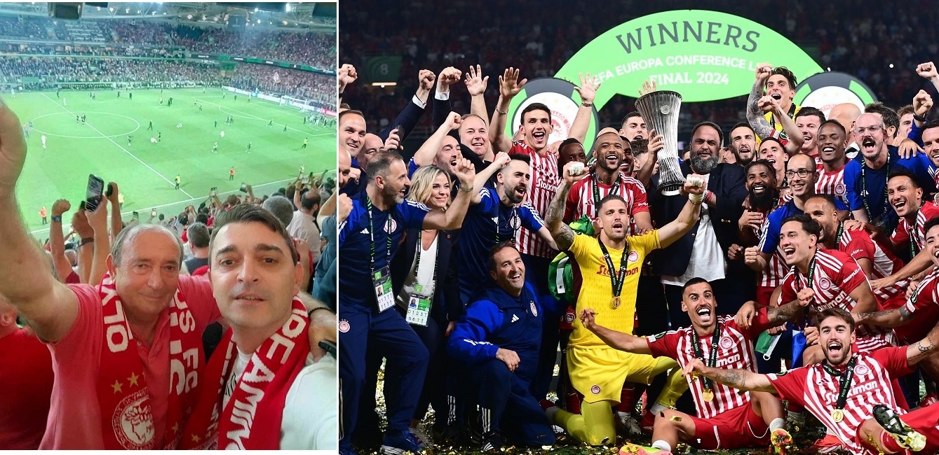 Οι συμπατριώτες μας Λάμπρος και ο γιος του Γιώργος Αυγέρης από τον Άγ. Γεώργιο Καλυβίων,ήταν από τους ελάχιστους "τυχερούς" που είχαν την ευκαιρία να δουν χθες από κοντά την αγαπημένη τους ομάδα, τον Ολυμπιακό, σε ένα ιστορικό ευρωπαϊκό παιχνίδι και να πανηγυρίσουν στο τέλος μαζί με τους χιλιάδες φιλάθλους, την κατάκτηση του UEFA Europa Conference League, στην Αθήνα!