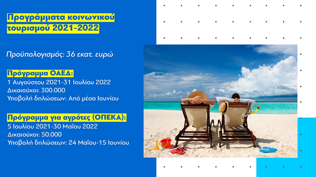 Το Υπουργείο Εργασίας και Κοινωνικών Υποθέσεων ανακοινώνει τα νέα προγράμματα Κοινωνικού Τουρισμού για την περίοδο 2021-2022, δηλαδή το ευρύ πρόγραμμα που υλοποιεί ο ΟΑΕΔ και την ειδική δράση για τους αγρότες που υλοποιεί ο ΟΠΕΚΑ. Τα προγράμματα αυτά θα δώσουν επιπλέον ώθηση στον ελληνικό τουρισμό, σε συνδυασμό με την νέα δέσμη στήριξης του κλάδου που ανακοινώθηκε πρόσφατα.