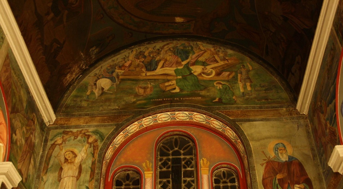 Η Μεγάλη Πέμπτη θεωρείται η πιο θλιβερή μέρα της χριστιανοσύνης με την κορύφωση του Θείου Δράματος και την Σταύρωση του Κυρίου. Η συγκεκριμένη εικόνα που δείχνει την Σταύρωση είναι αποτυπωμένη σε μια μεγάλη τοιχογραφία η οποία βρίσκεται εντός του Ι.Ν. Αγίου Νικολάου Καλυβίων!
