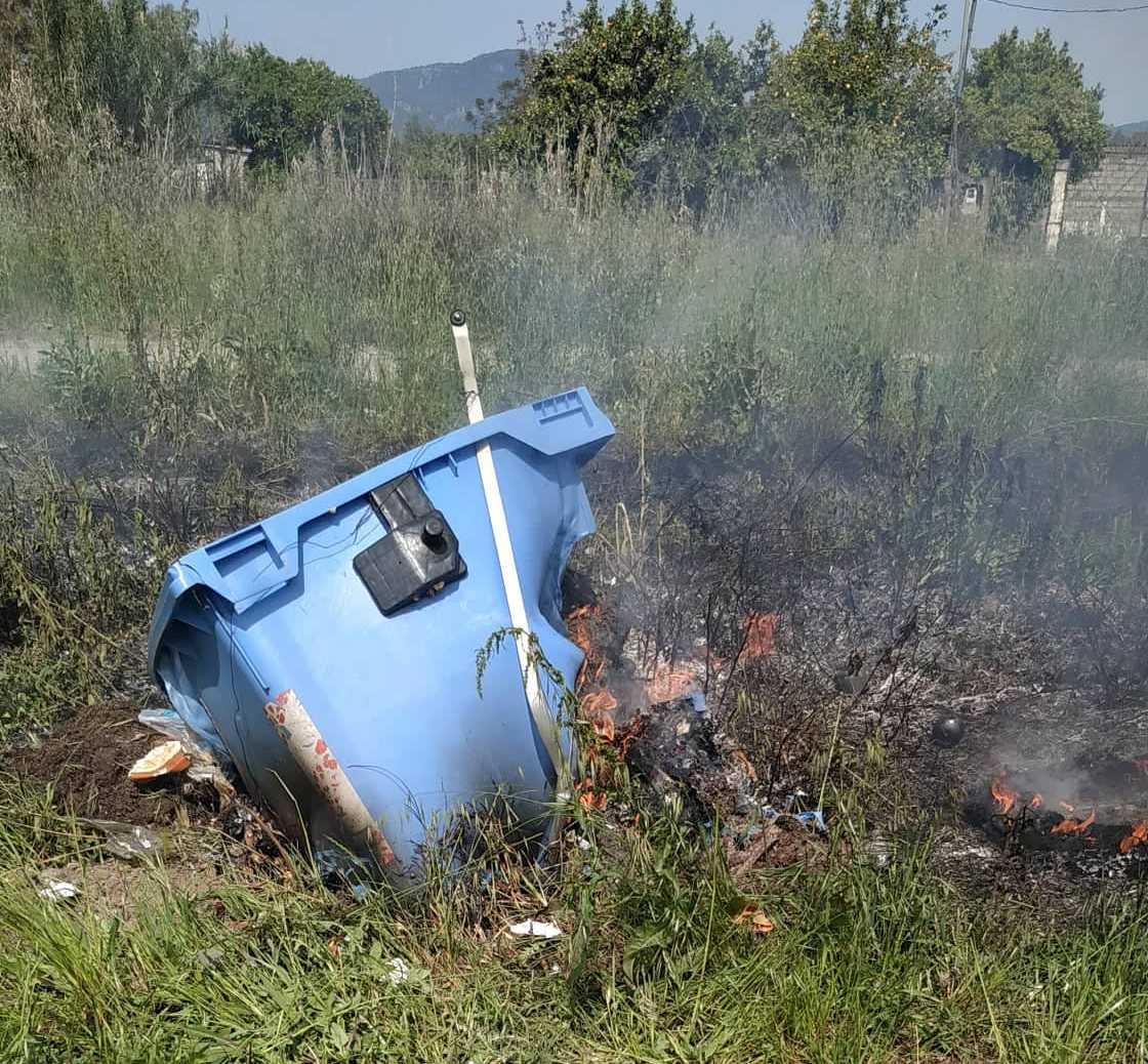 Ένας μπλε κάδος απορριμμάτων κάηκε ολοσχερώς σήμερα το πρωί στην περιοχή του οικισμού Αγίου Γεωργίου Καλυβίων, μάλλον από εστία φωτιάς που προκλήθηκε αρχικά στην υπάρχουσα βλάστηση.