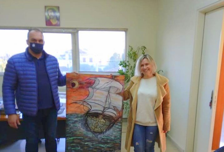 Έναν όμορφο ζωγραφικό πίνακα που αναπαριστά ένα ιστιοφόρο στη φουρτουνιασμένη θάλασσα, παρέδωσε χθες στον Προέδρο της Κοινότητας Καλυβίων, η συμπολίτισά μας Χρυσούλα Φούκα-Ζαπαντιώτη, η οποία είναι αυτοδίδακτη ζωγράφος.