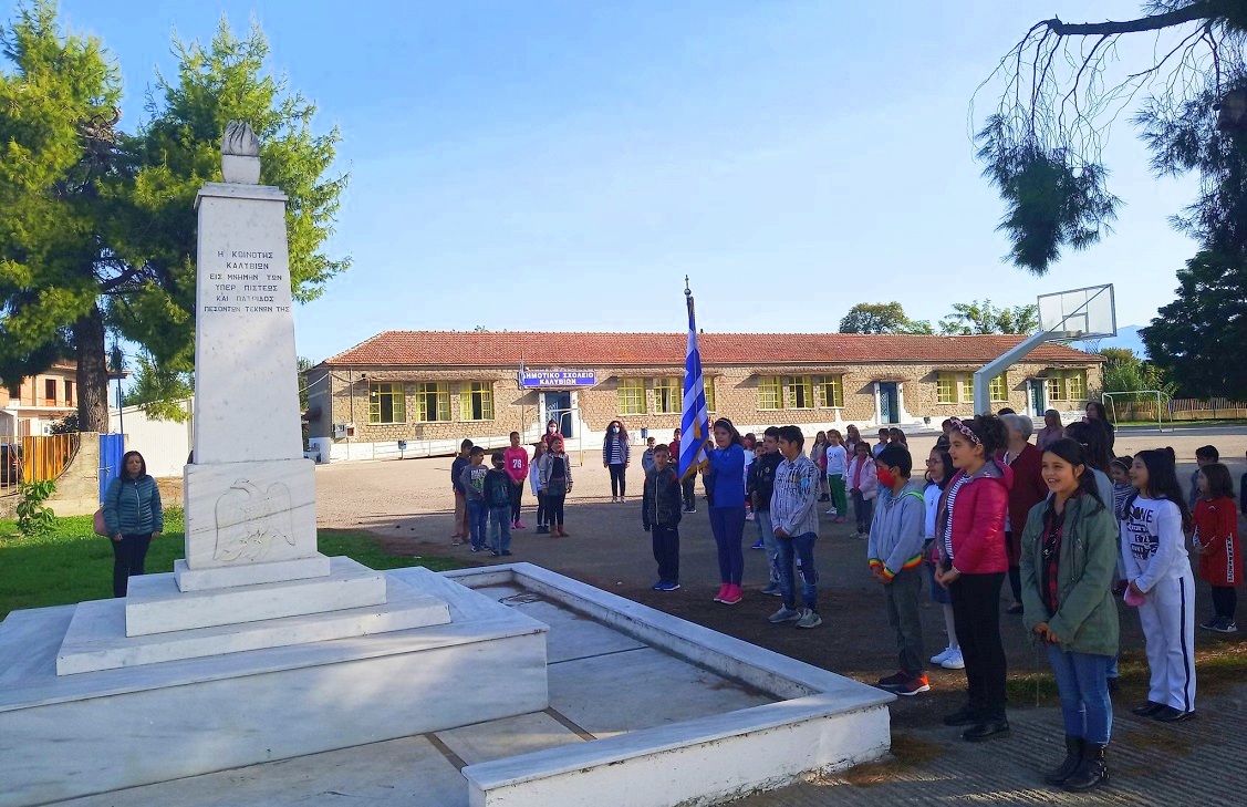 Δίπλα στο Μνημείο Πεσόντων στο προαύλιο του Δημοτικού Σχολείου Καλυβίων πραγματοποιήθηκε το πρωί παρουσία των εκπαιδευτικών και των μαθητών, ο εορτασμός της Εθνικής Εορτής και του ηρωϊκού έπους του ‘40, με την παράδοση της σημαίας στην σημαιοφόρο και με αναφορές στην ιστορική επέτειο.