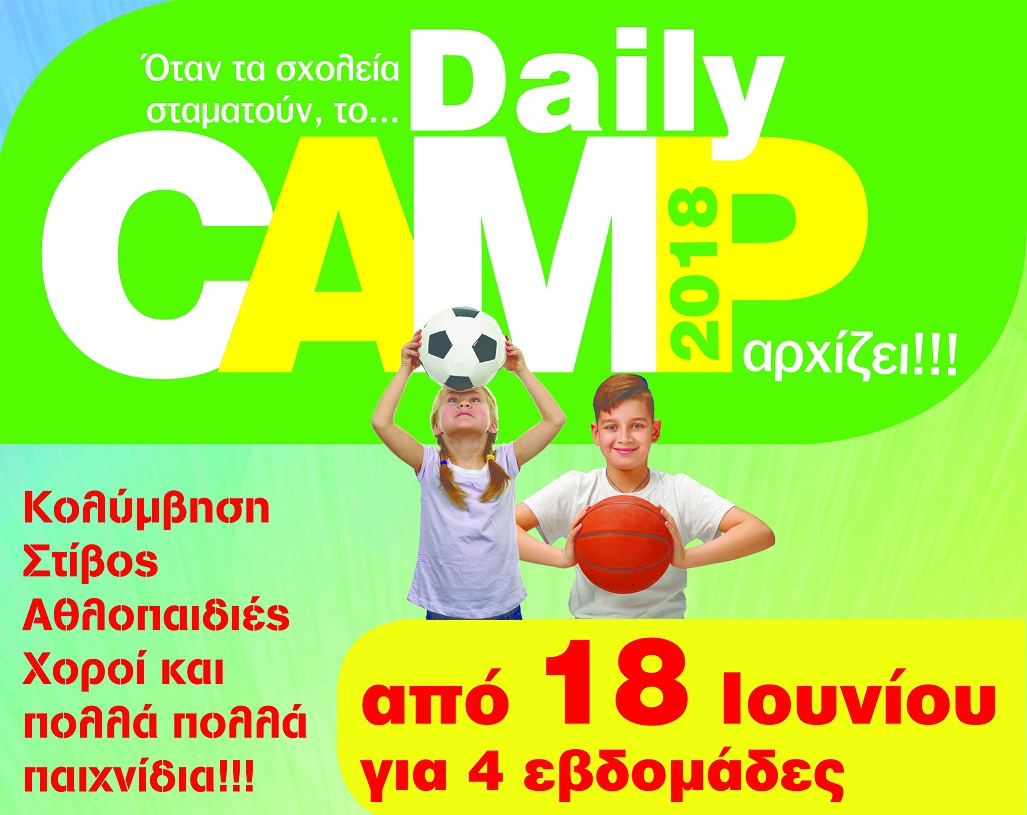 Από τις 18 Ιουνίου και για 4 εβδομάδες διοργανώνεται στο Δημοτικό Αθλητικό Κέντρο Αγρινίου «Μιχάλης Κούσης» το Daily Camp 2018 με προγράμματα κολύμβησης, στίβου, χορού και πολλά παιχνίδια για τα παιδιά ηλικίας 5-12 ετών. Οι ενδιαφερόμενοι μπορούν να απευθύνονται στο τηλ. 26410 23818 (πρωινές ώρες από τις 8.00- 14.00).