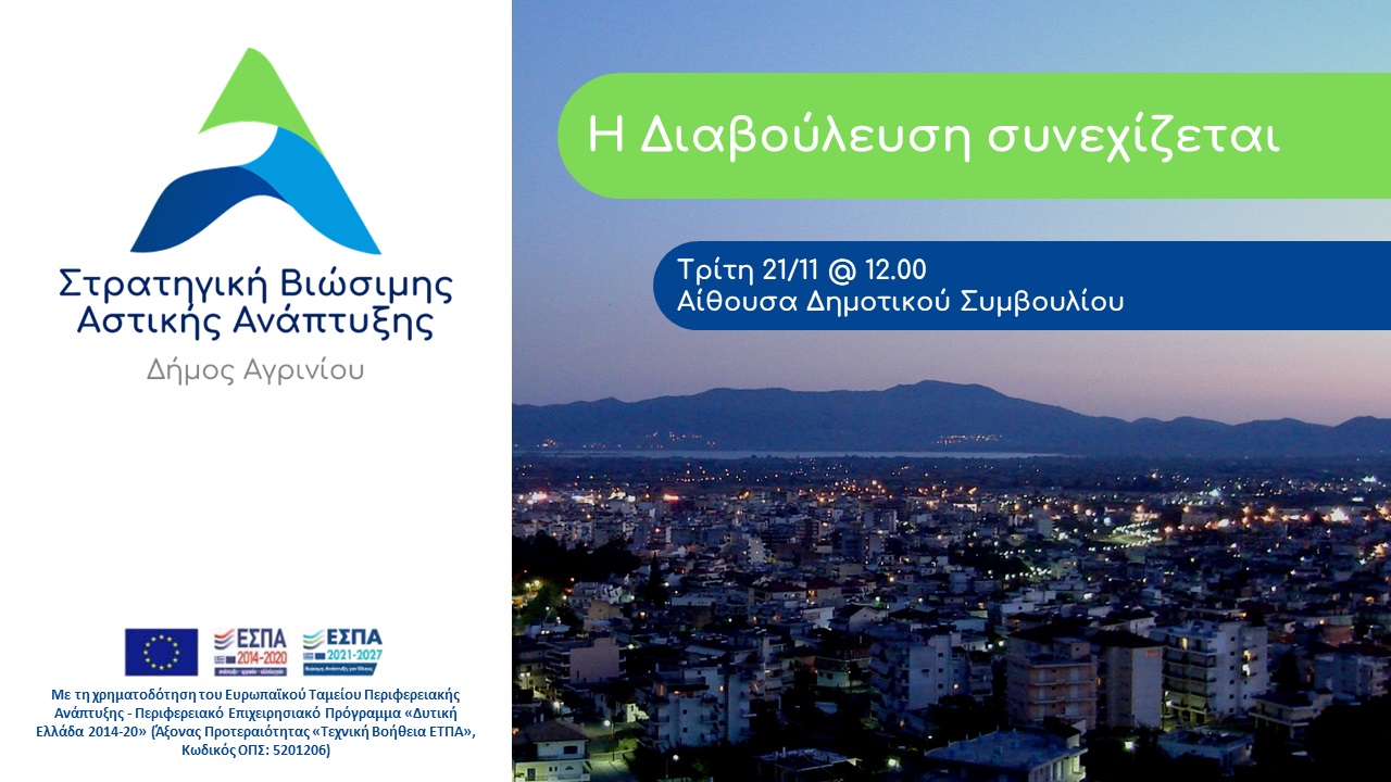 Ο Δήμος Αγρινίου, ο Δήμος Θέρμου, το Τεχνικό Επιμελητήριο Ελλάδας, η Γενική Γραμματεία Χωρικού Σχεδιασμού και Αστικού Περιβάλλοντος του Υπουργείου Περιβάλλοντος & Ενέργειας, καθώς και ο Ανάδοχος της Μελέτης ΕΠΣ, προσκαλούν τους πολίτες, τους φορείς και τα ΜΜΕ στην επίσημη παρουσίαση των Εναλλακτικών Σεναρίων και του Προκρινόμενου Σεναρίου της μελέτης: Ειδικού Πολεοδομικού Σχεδίου Δήμου Αγρινίου – Δήμου Θέρμου (ΔΕ Παραβόλας, Μακρυνείας, Αρακύνθου, Θεστιέων, Αγρινίου, Αγγελοκάστρου)».