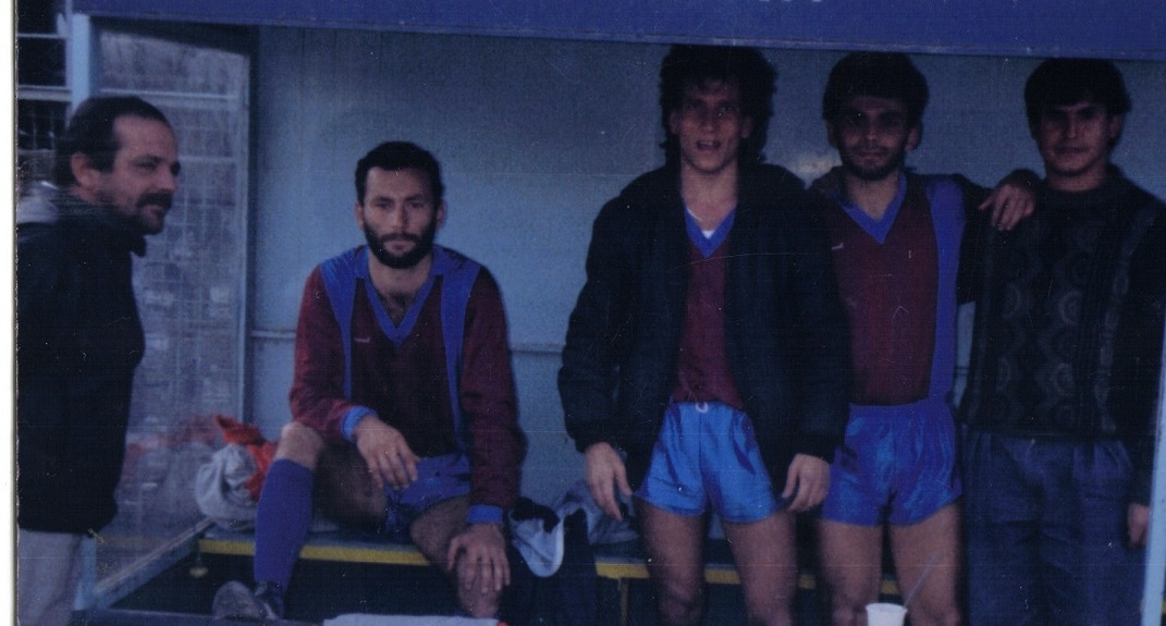 1985-1986: Μπλε και βυσσινί ριγέ εμφάνιση: Διακρίνονται από αριστερά ο Χρήστος Μπελεβώνης (παράγοντας), Βασίλης Τουρλίδας, Απόστολος Ανατσούτσουλας, Γιώργος Μπελεβώνης και Νίκος Ι. Τάγκαλος.