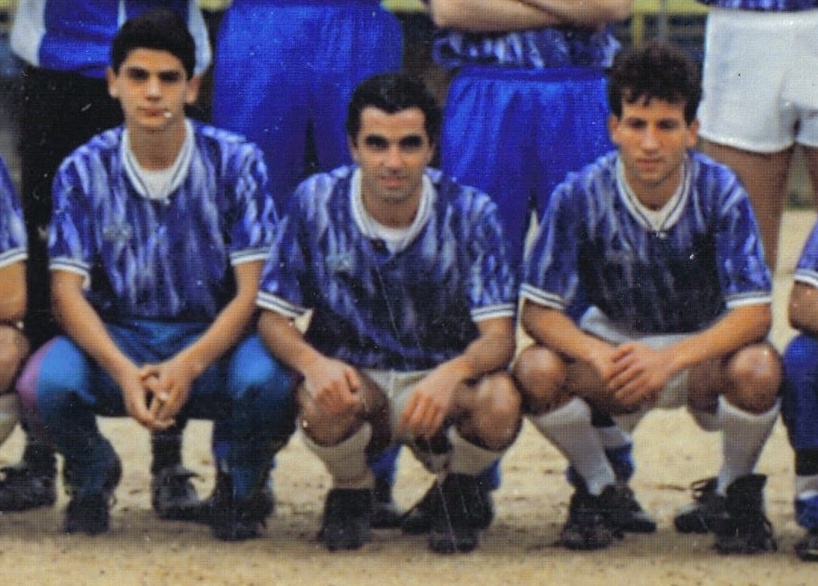 1992-93: Παραλλαγής, με μπλε και άσπρες αποχρώσεις. Διακρίνονται από αριστερά, Γεράσιμος Χ. Μπελεβώνης, Μιχάλης Γκέκας και Αποστόλης Ανατσούτσουλας.