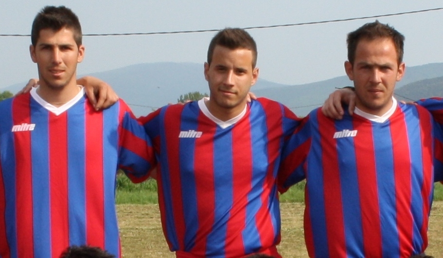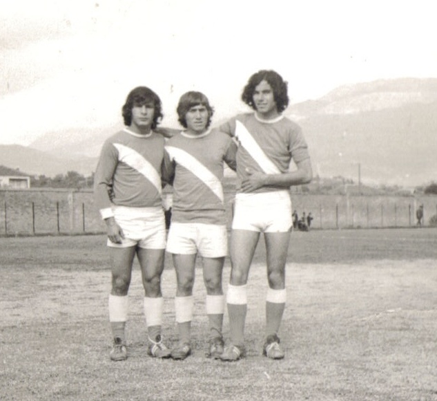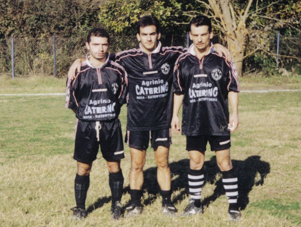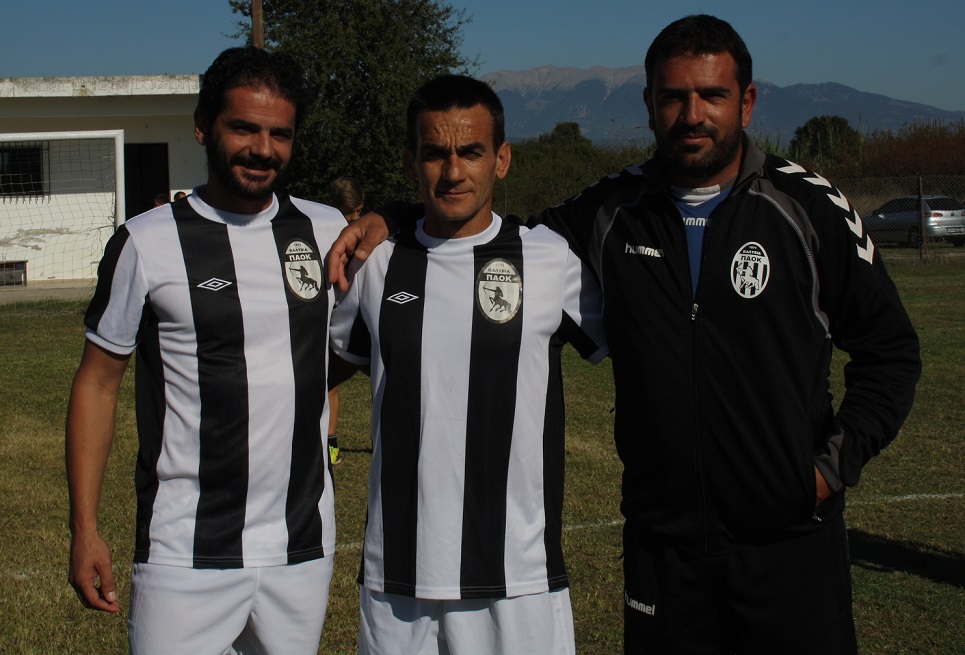 Διακρίνονται από αριστερά οι ποδοσφαιριστές: Χρήστος Τάγκαλος, Πάνος Μπαλωμένος, Σπύρος Μάης.