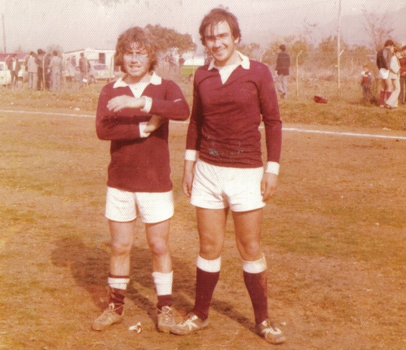1977: Με βυσσινί εμφάνιση και άσπρο γιακά: Οι παίκτες, Πάνος Μπαλωμένος και Δημήτρης Μεσογίτης.