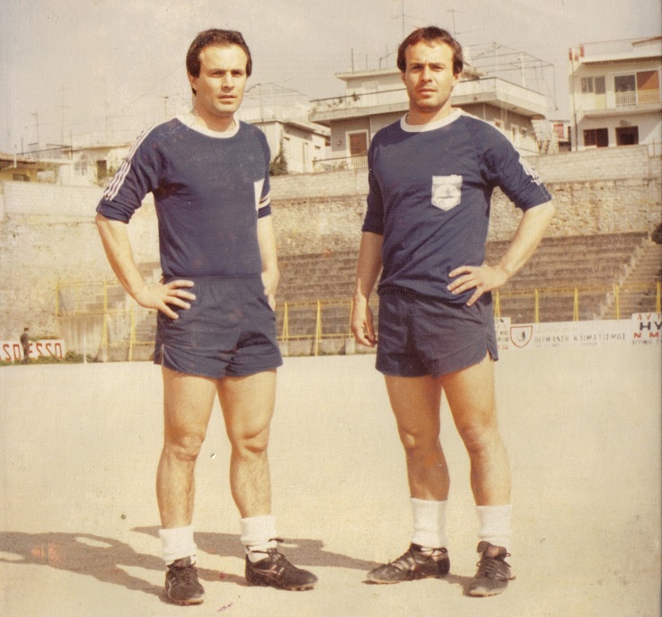 1980: Μπλε εμφάνιση με άσπρες ρίγες. Τα αδέρφια Πάνος και Λάκης Αντωνόπουλος.