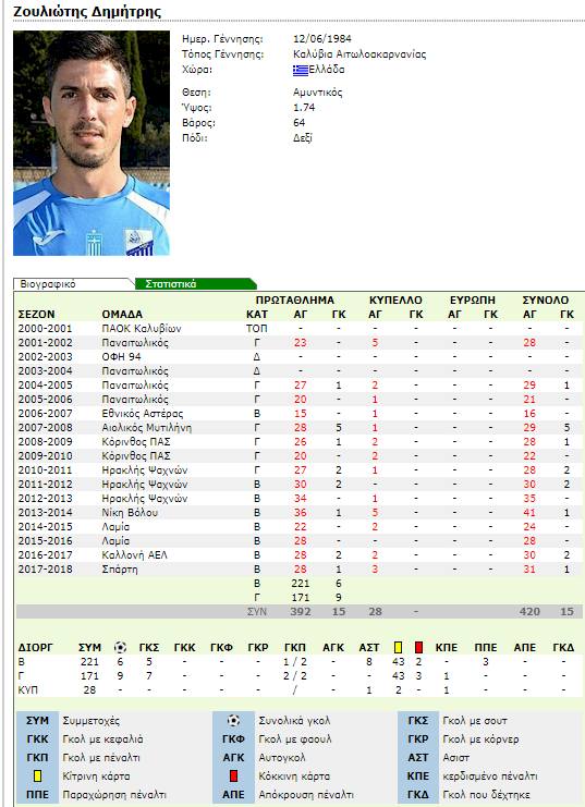 Το soccerbase.gr έχει καταγράψει μια μια τις παρουσίες του και σας παρουσιάζει την καριέρα του με αριθμούς από το 2001 ως και σήμερα, που αγωνίζεται στις Εθνικές κατηγορίες.