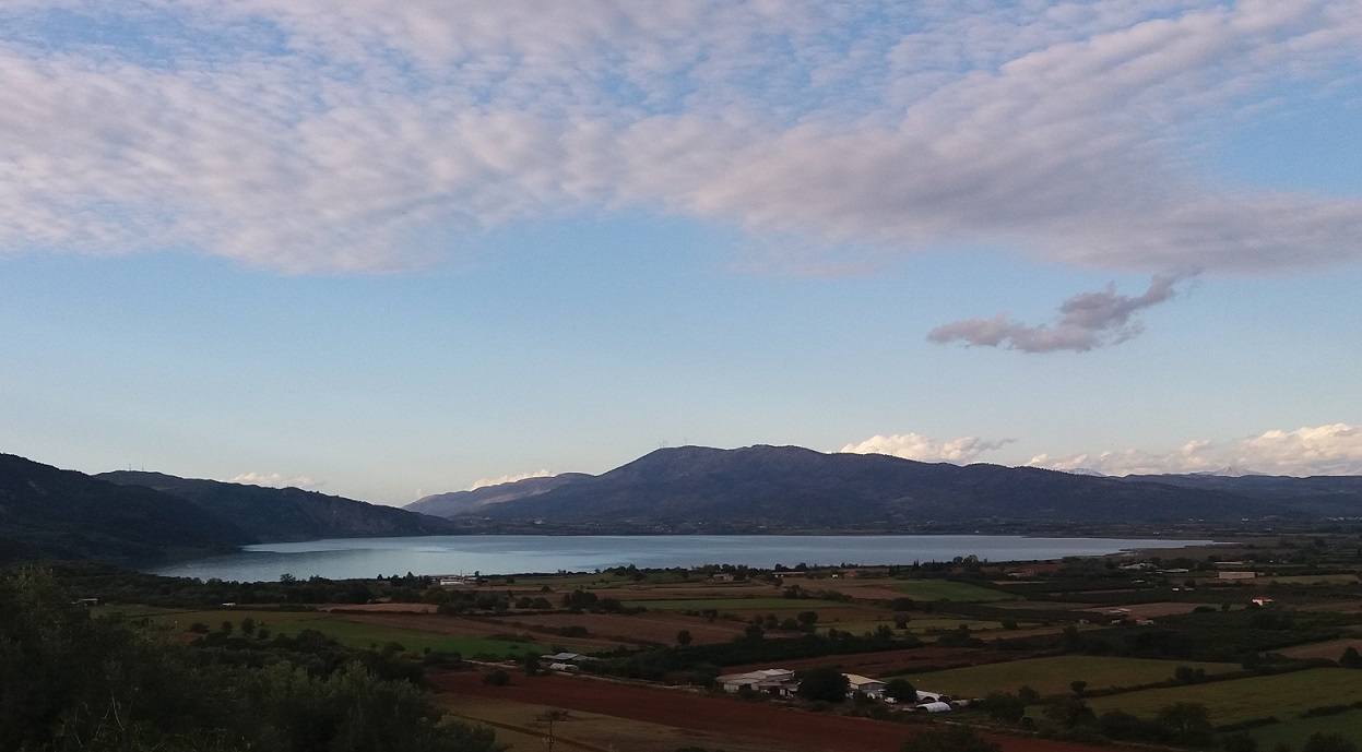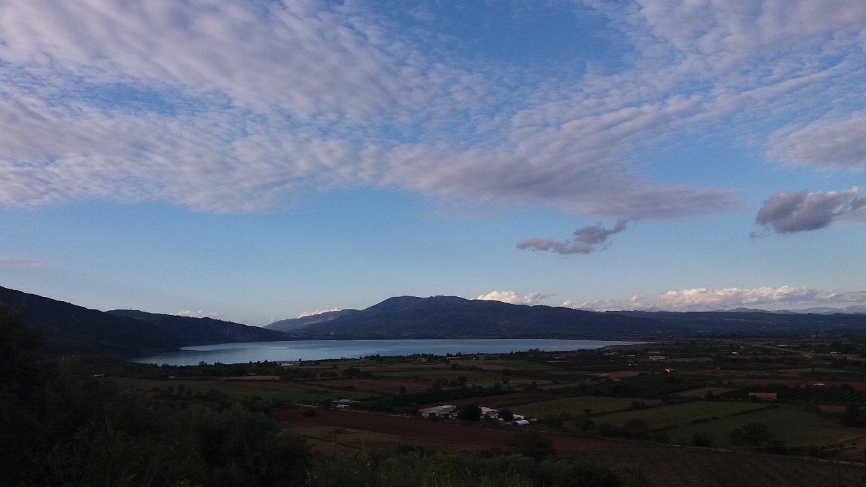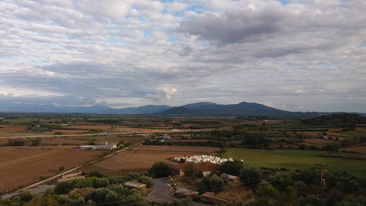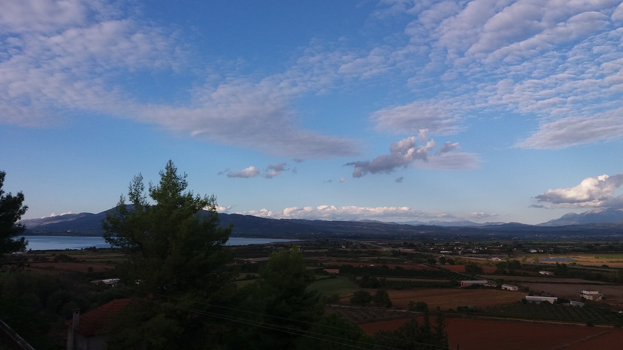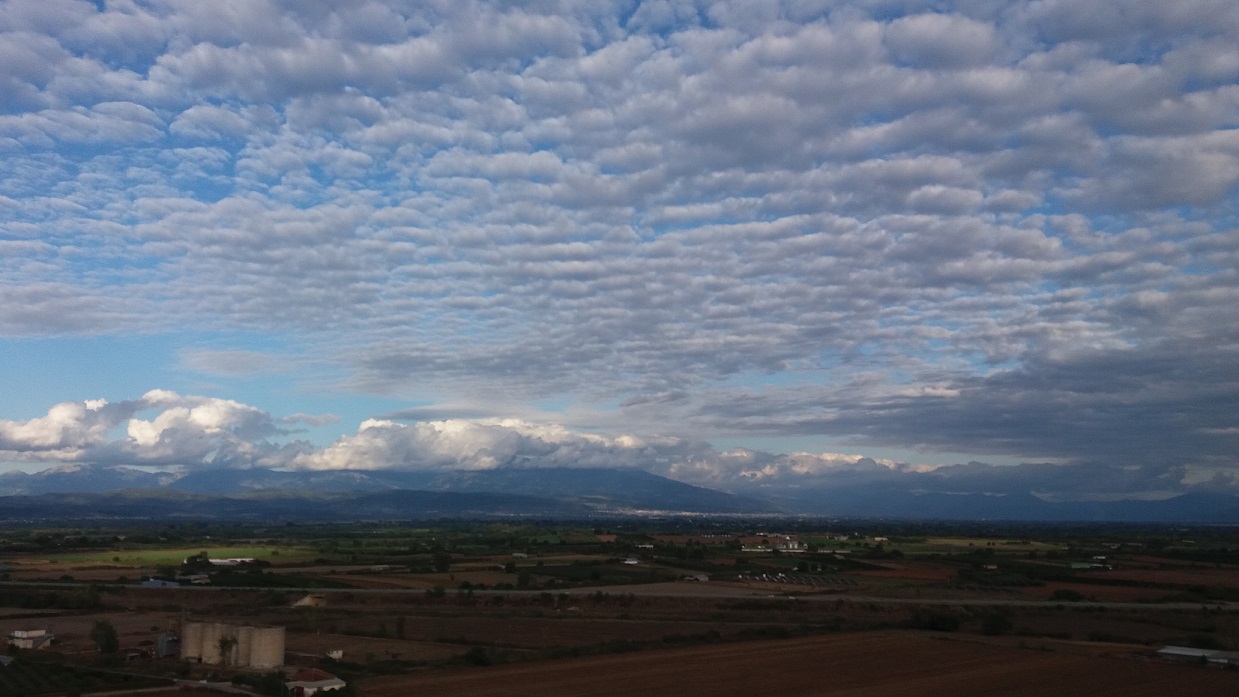 Λίγη ώρα πριν σουρουπώσει τα κυματοειδή σύννεφα προσδίδουν μια ηρεμία από άκρη σε άκρη της πεδιάδας, τα χρώματα στη φύση απαλά και σκουρόχρωμα, τα φώτα στα γύρω χωριά και στην μεγάλη πόλη σε λίγο θα φωτίσουν τους δρόμους και τα σπίτια…