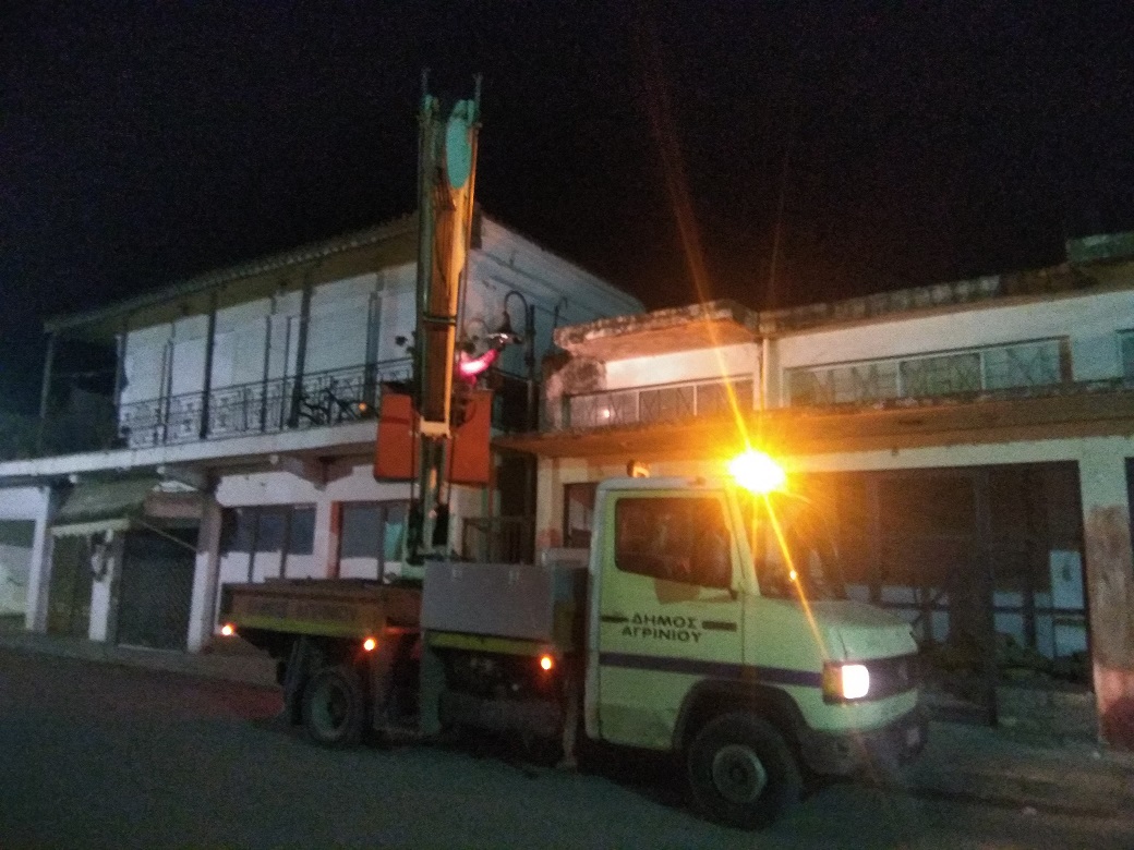 Οι εργασίες με ειδικό γερανοφόρο ξεκίνησαν αρχικά από τον Πλάτανο, συνεχίστηκαν κατόπιν στα Καλύβια και ακολούθως στη διαδρομή προς τον Άγιο Γεώργιο, παρουσία του Προέδρου της Κοινότητας, Δ. Αναστασίου, ενώ οι υπάλληλοι του δήμου αποκατέστησαν τις εντοπισμένες βλάβες στο δίκτυο φωτισμού.