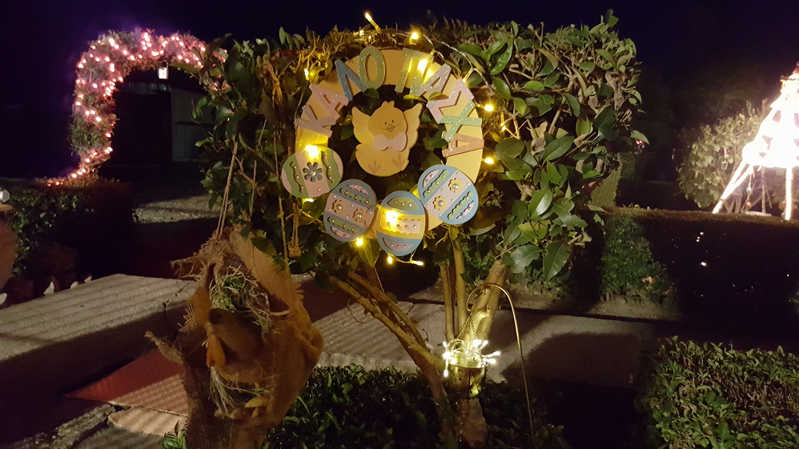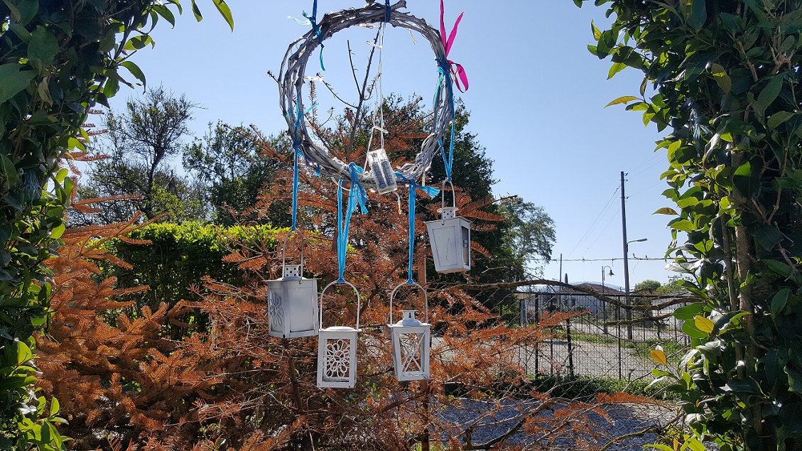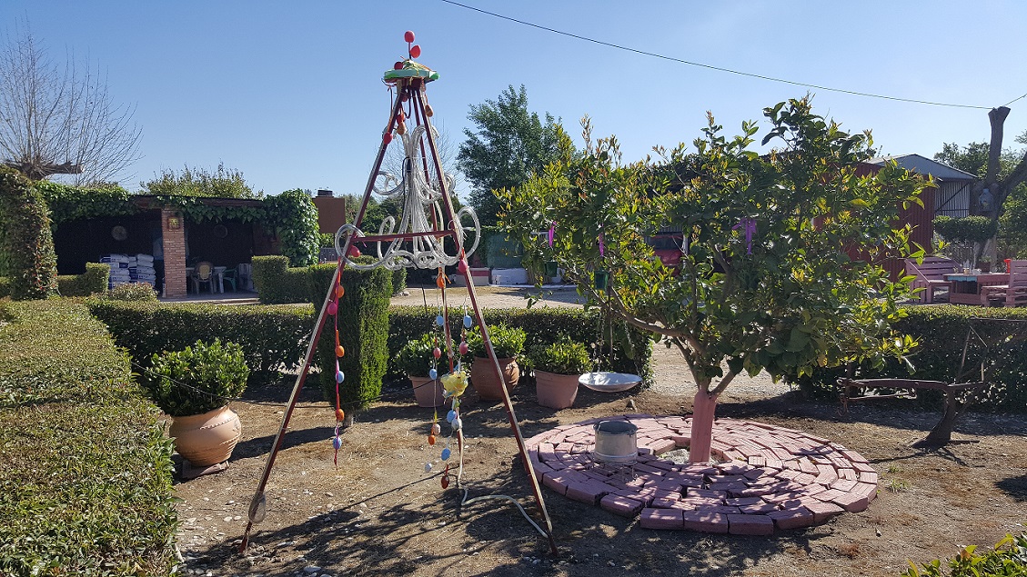 Για άλλη μια χρονιά, ο κήπος στολίστηκε με μεγάλα διακοσμητικά αυγά, με συνθέσεις λουλουδιών και πολύχρωμων βαμμένων αυγών κρεμασμένα στο κιόσκι ή στο φράκτη, τοποθετημένα δίπλα σε παλιά αντικείμενα που έχει συγκεντρωθεί με μεγάλο προσωπικό κόπο…