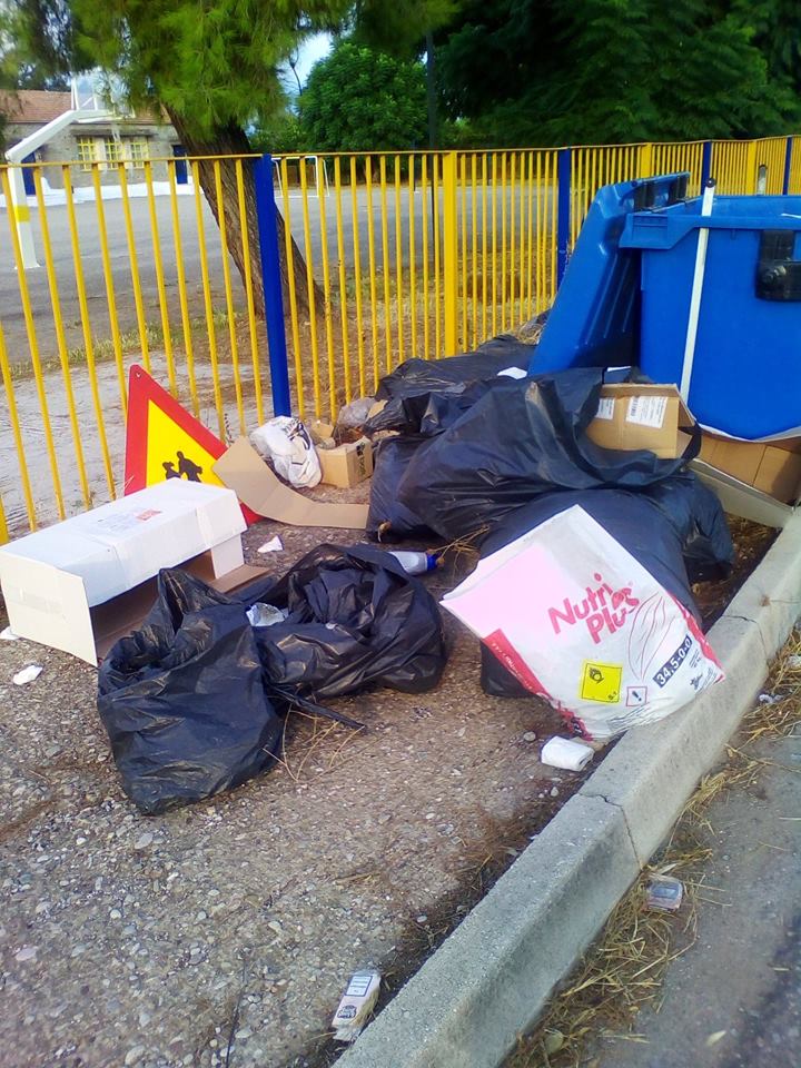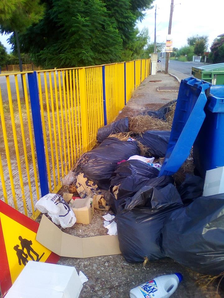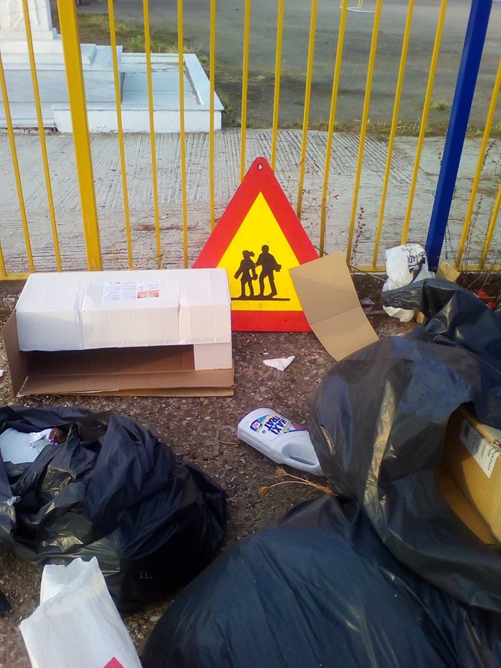 Οι πλαστικές σακούλες, όπως και μια πινακίδα οδικής σήμανσης, είναι συγκεντρωμένες έξω από το σχολείο στον κεντρικό δρόμο και περιμένουν να να φορτωθούν από συνεργείο καθαριότητας τις επόμενες μέρες.