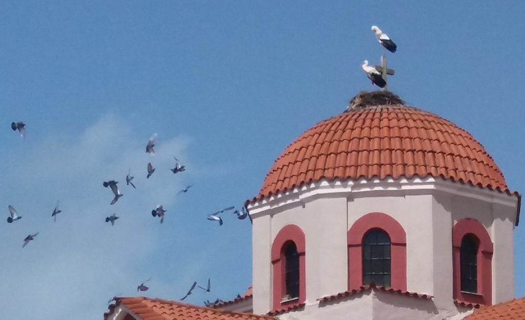 Ένα ζευγάρι πελαργών που διαχείμασαν στην περιοχή μας κατά τη διάρκεια του χειμώνα και δεν μετανάστευσαν… ποτέ, έχουν παραμείνει στη παλιά φωλιά πάνω στον τρούλο της εκκλησίας του Αγίου Νικολάου και ετοιμάζονται να φτιάξουν τη δικιά τους φαμίλια!