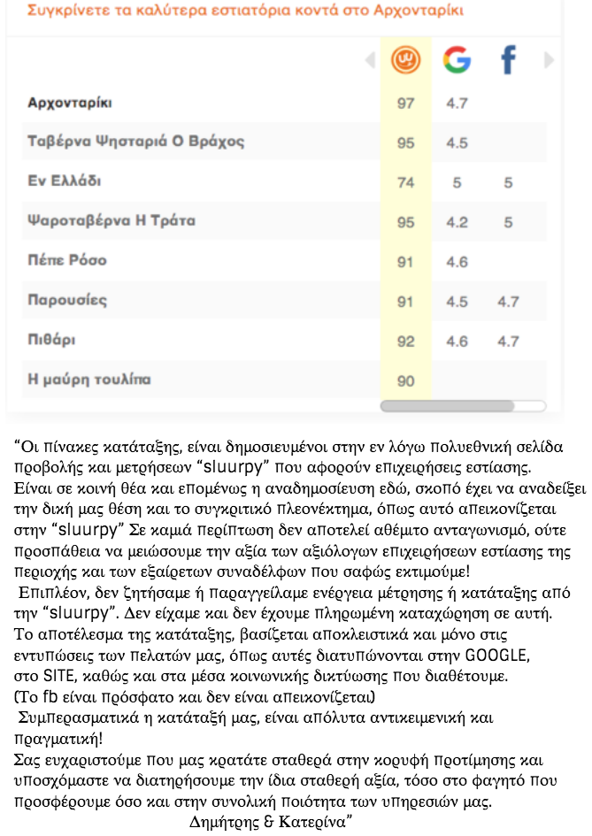 Οι ιδιοκτήτες της Ταβέρνας ¨Αρχονταρίκι¨ γράφουν σχετικά: