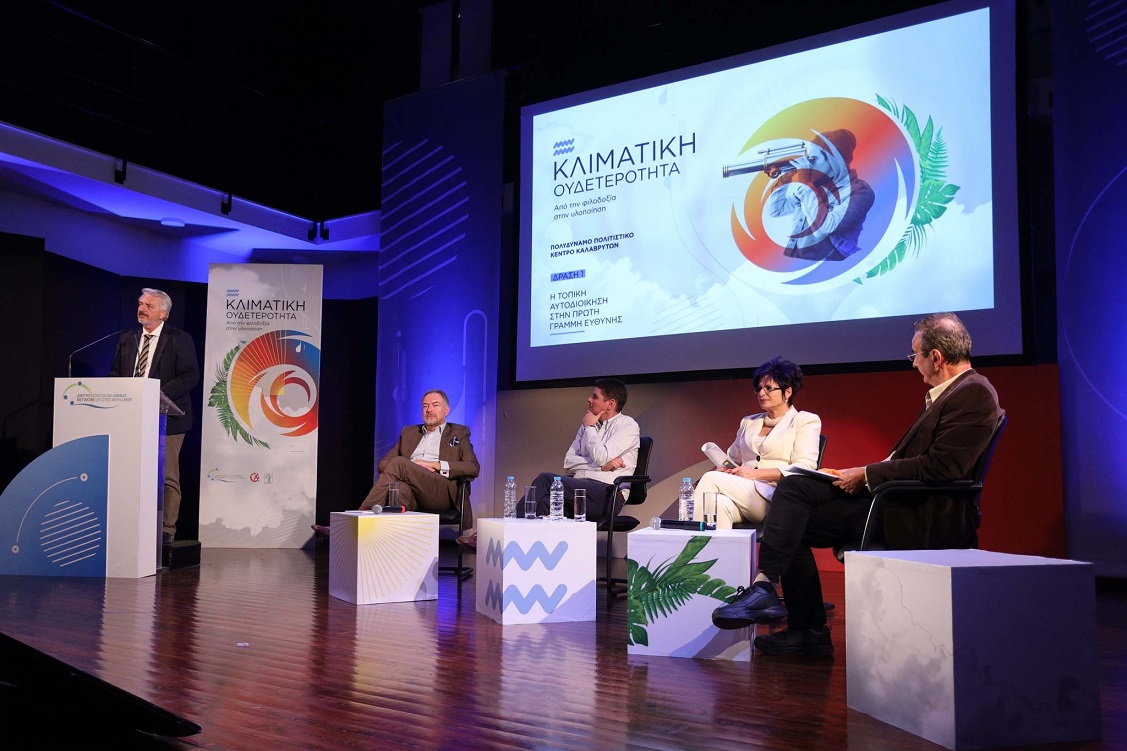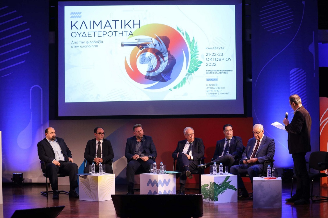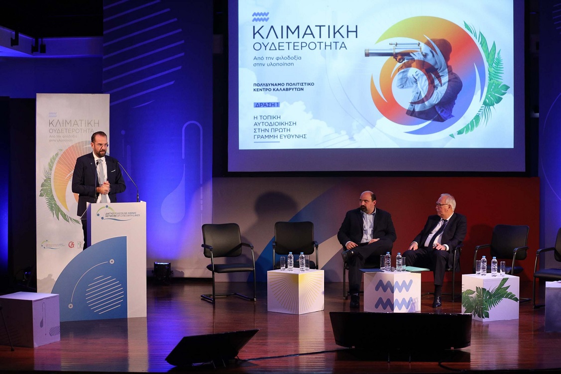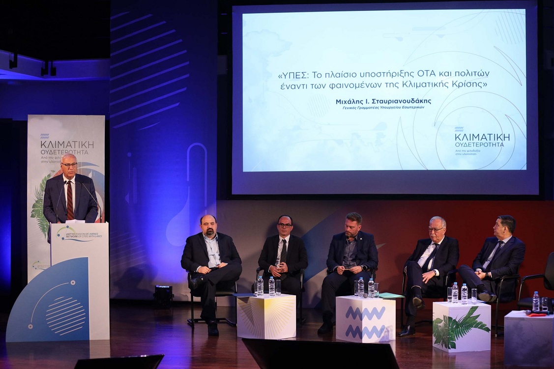 -Ο Γενικός Γραμματέας Εσωτερικών & Οργάνωσης του Υπουργείου Εσωτερικών Μιχάλης Ι. Σταυριανουδάκης, τόνισε ότι η Τοπική Αυτοδιοίκηση έχει αποδείξει ότι διαθέτει την ικανότητα διαχείρισης δύσκολων καταστάσεων ενώ η κυβέρνηση έχει δημιουργήσει ισχυρό θεσμικό πλαίσιο για την προστασία του περιβάλλοντος και την προσαρμογή στην κλιματική αλλαγή. «Έχει δημιουργηθεί αποτελεσματικός μηχανισμός αντιμετώπισης κρίσεων και κινδύνων, θεσμοθετήθηκε η δυνατότητα κήρυξης περιοχών προληπτικά και όχι μόνο μετά την καταστροφή, σε ειδική κινητοποίηση ενώ εξασφαλίστηκε η ταχύτατη αδειοδότηση έργων πρόληψης όπως η διάνοιξη αντιπυρικών ζωνών και αντιπλημμυρικά». Σημείωσε ακόμη πως στα 13 προγράμματα του «Αντώνης Τρίτσης» περιλαμβάνεται πλήθος δράσεων που αφορούν στις Ανανεώσιμες Πηγές Ενέργειας και στην ηλεκτροκίνηση, αναφέροντας πως το συνολικό ύψος του προγράμματος διαμορφώνεται στα 3,5 δις ευρώ, έχουν κατατεθεί συνολικά 1162 προτάσεις και μέχρι τώρα έχουν εγκριθεί 335 έργα, ύψους 1,1 δις ευρώ. Πρόσθεσε δε ότι οι πολιτικές εφαρμογές για την προσαρμογή στην κλιματική αλλαγή, η απλοποίηση του θεσμικού πλαισίου για τη διαδικασία της χρηματοδότησης των πληγέντων (με πέντε βασικά βήματα) και οι προσκλήσεις που έχουν προβλεφθεί από τα αναπτυξιακά προγράμματα "Α. Τρίτσης" και το " Πρόγραμμα Αντιμετώπισης Φυσικών Καταστροφών" αποτελούν μέρος του στρατηγικού σχεδιασμού της Κυβέρνησης.