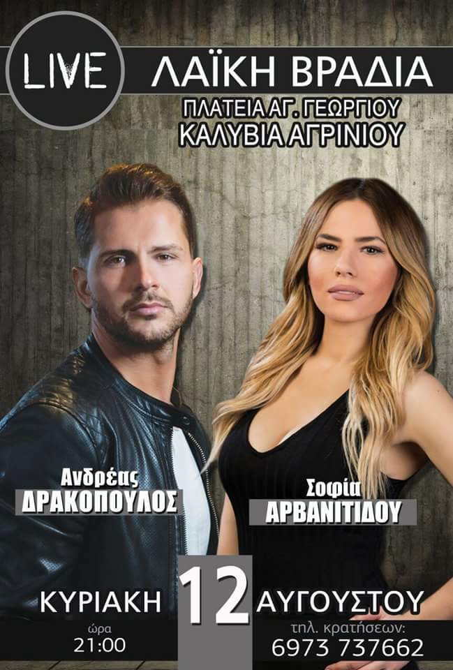 Λαϊκή μουσική βραδιά με τον συμπατριώτη μας τραγουδιστή Ανδρέα Δρακόπουλο και την τραγουδίστρια Σοφία Αρβανιτίδη, διοργανώνεται την Κυριακή 12 Αυγούστου 2018, στις 9 το βράδυ, στην γραφική πλατεία του οικισμού Αγ. Γεωργίου, Καλυβίων Αγρινίου!