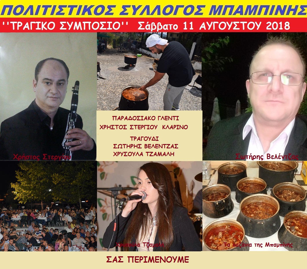 Η κορύφωση των Πολιτιστικών Εκδηλώσεων στη Μπαμπίνη θα πραγματοποιηθεί το Σάββατο στις 11 Αυγούστου 2018 με την διεξαγωγή του καθιερωμένου πλέον «ΤΡΑΓΙΚΟΥ ΣΥΜΠΟΣΙΟΥ». Προσφέρετε δωρεάν τράγος με μακαρόνια βρασμένα σε παραδοσιακά καζάνια από τους ΣΕΦ του είδους ΣΠΥΡΟ & ΣΩΤΗΡΗ. ΜΠΕΝΕΚΟ ,θα ακολουθήσει παραδοσιακό γλέντι μέχρι τι πρωινές ώρες Με τους ΣΩΤΗΡΗ ΒΕΛΕΤΖΑ-ΧΡΥΣΟΥΛΑ ΤΖΑΜΑΛΗ στο τραγούδι & στο κλαρίνο ο ΧΡΗΣΤΟΣ ΣΤΕΡΓΙΟΥ