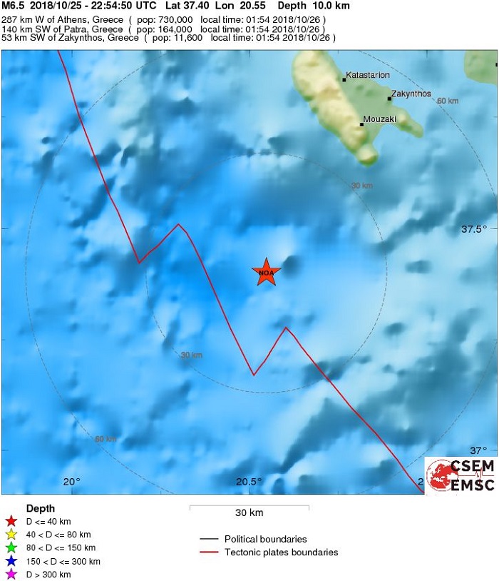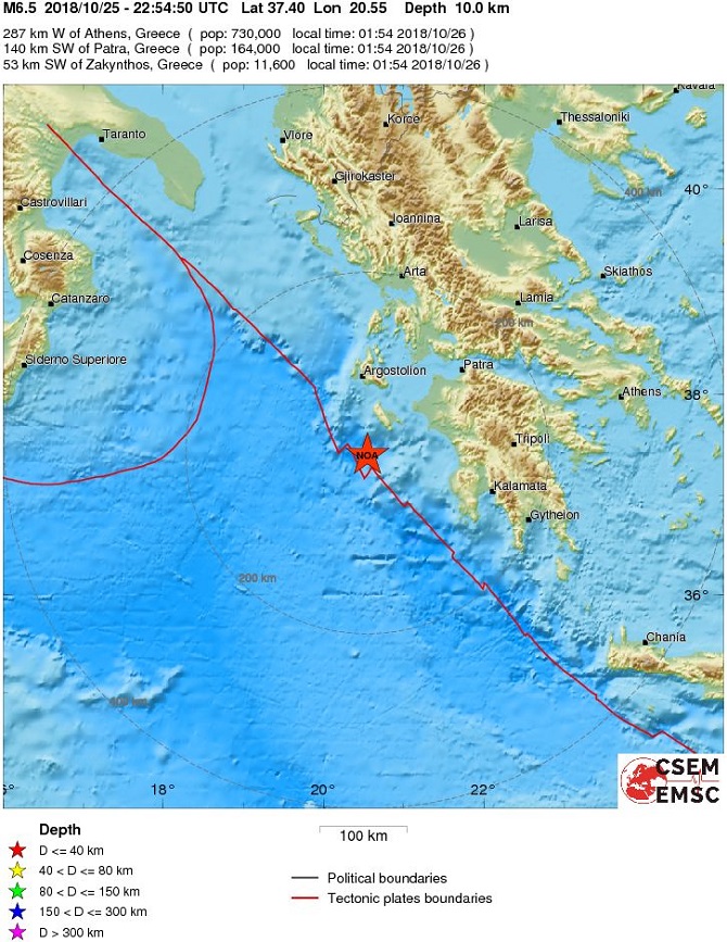 M 6.4, 26/10 01:53, βάθος 10 χλμ, 54 χλμ ΝΔ από Ζάκυνθος