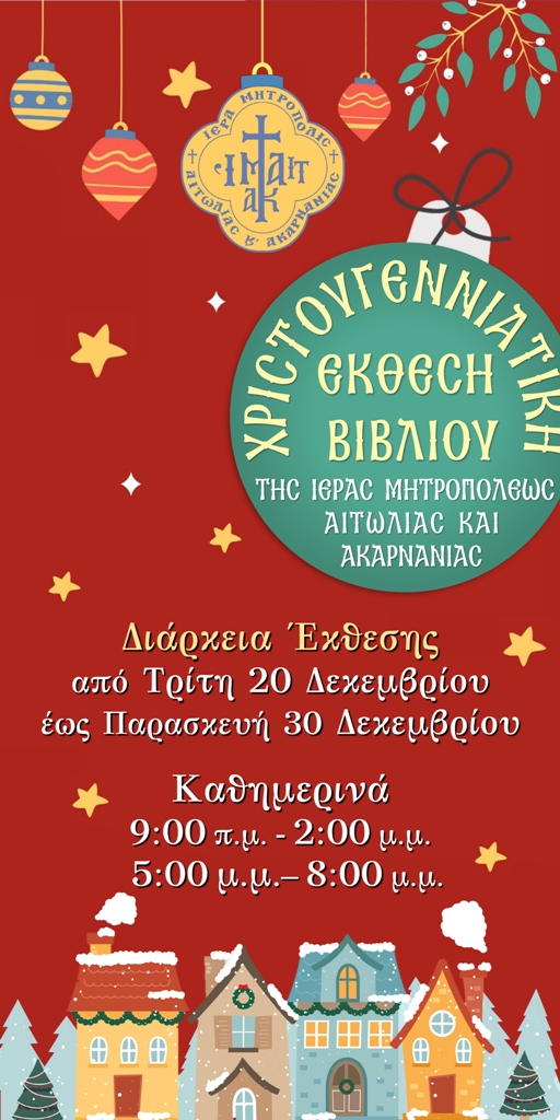 Το Βιβλιοπωλείο ΦΑΡΟΣ ΟΡΘΟΔΟΞΙΑΣ της Ιεράς Μητροπόλεως Αιτωλίας και Ακαρνανίας, διοργανώνει Χριστουγεννιάτικη Έκθεση Βιβλίου στο Πνευματικό Κέντρο του Ιερού Ναού Αγίας Τριάδος Αγρινίου.