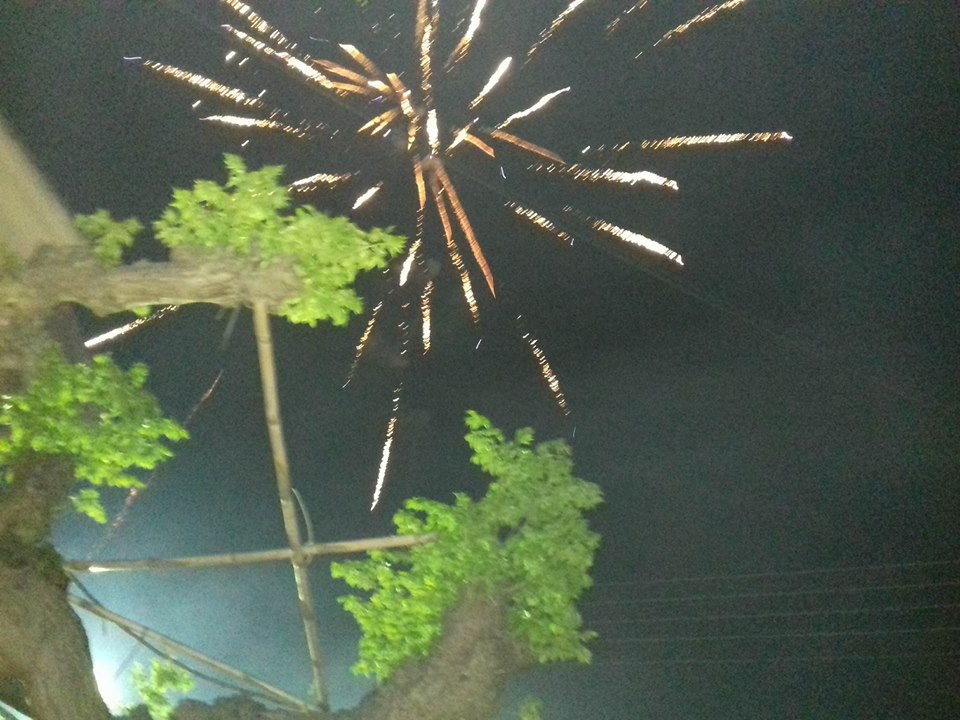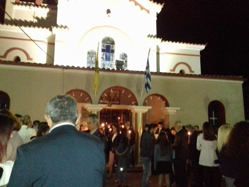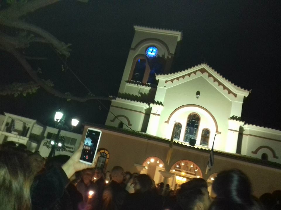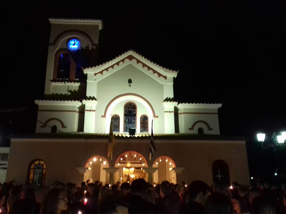 Στο προαύλιο του ναού λίγο μετά τα μεσάνυχτα ακούστηκε το «Χριστός Ανέστη» από τον ιερέα Θ. Αθανασόπουλο και τους ιεροψάλτες, οι καμπάνες χτυπούσαν χαρμόσυνα, ενώ το νυχτερινό ουρανό φώτισαν οι λάμψεις των δεκάδων πυροτεχνημάτων.
