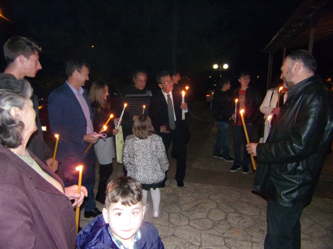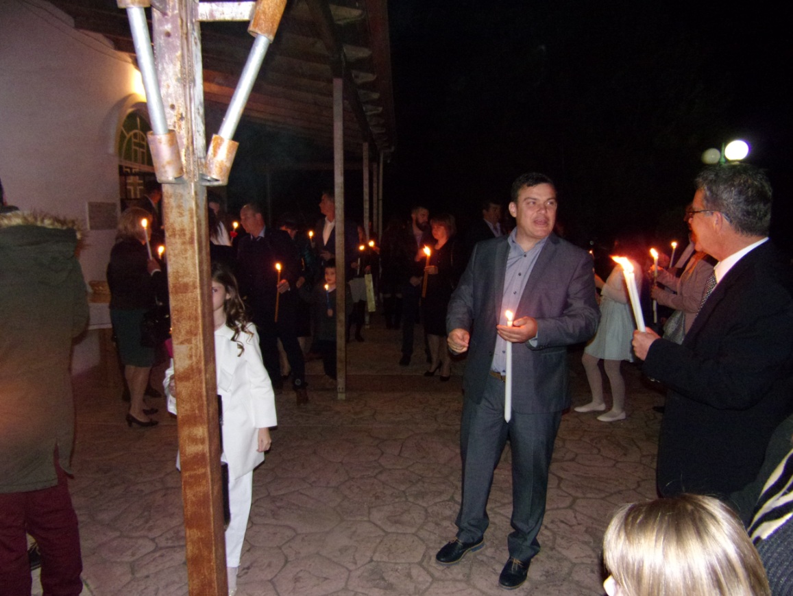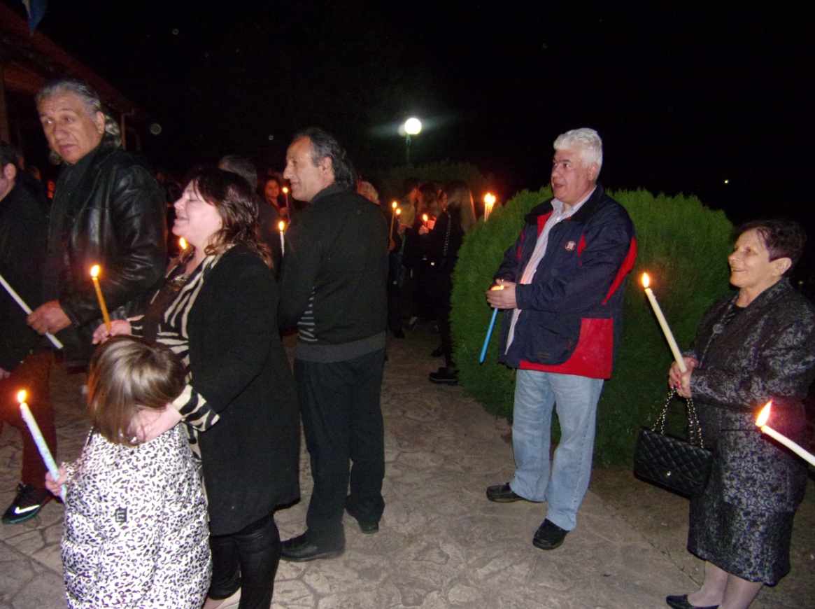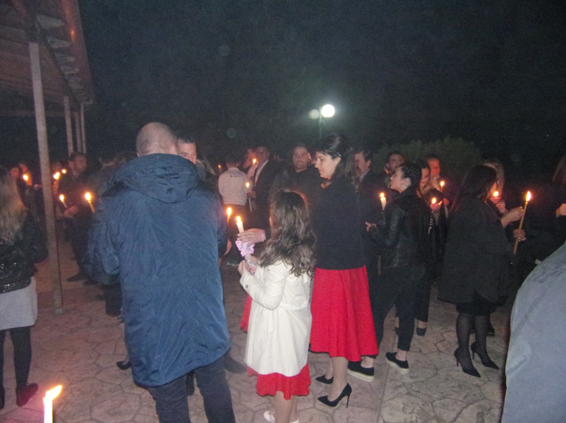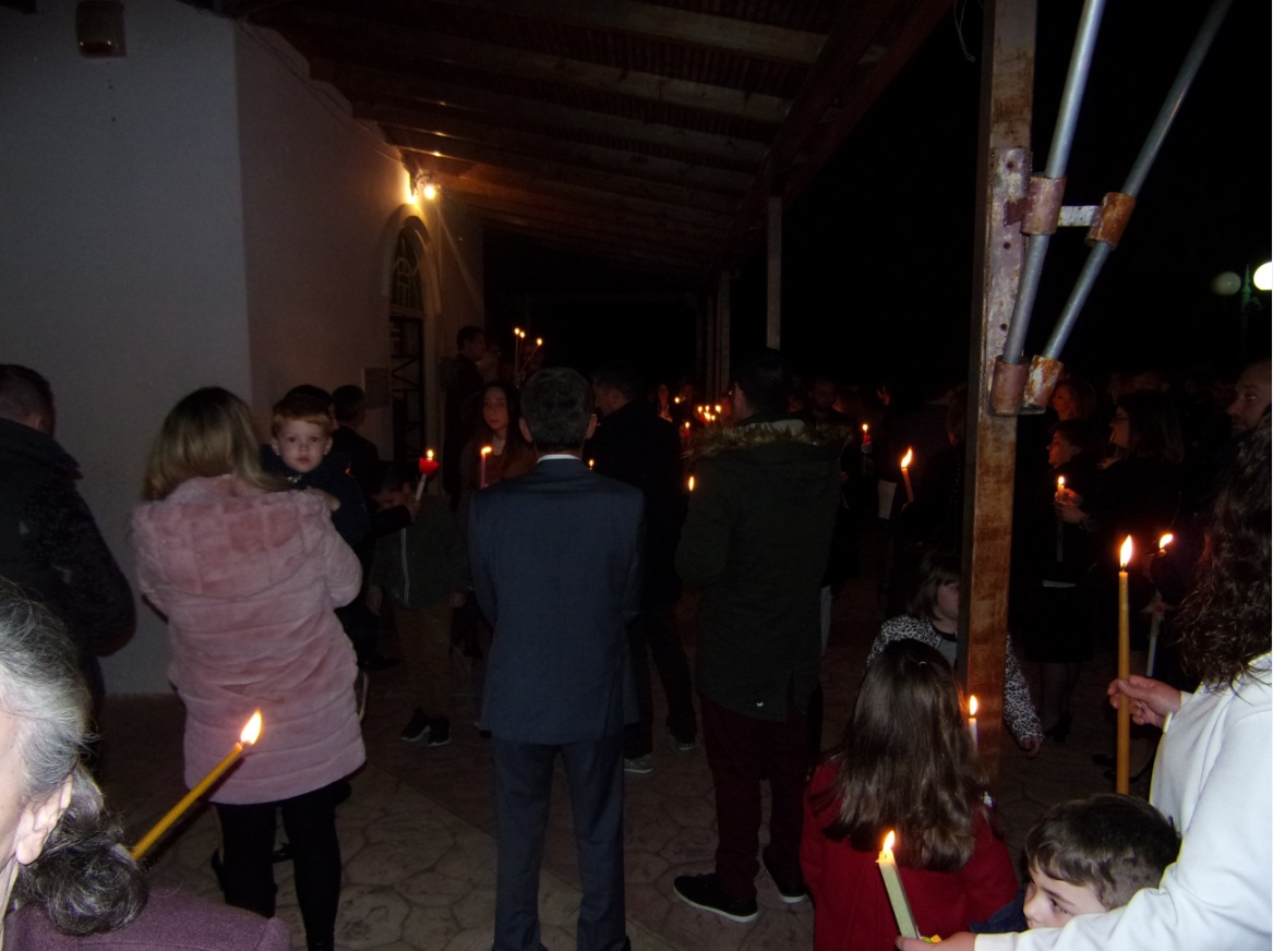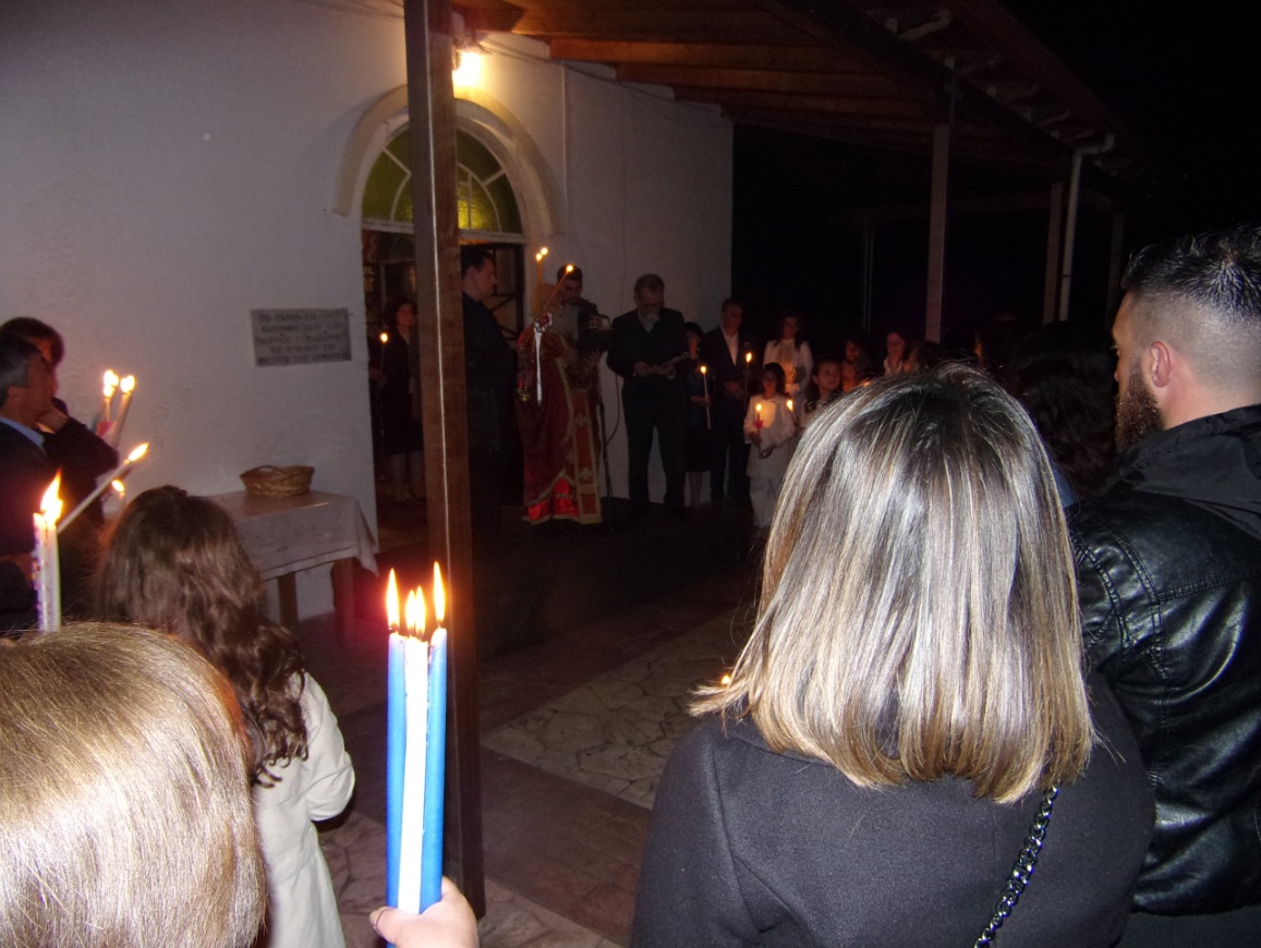 Ο ιερέας π. Β. Σαράκης μετέδωσε στους πιστούς το Άγιο Φως και στη συνέχεια στο προαύλιο του ναού έψαλλαν όλοι μαζί το «Χριστός Ανέστη» ενώ τα πυροτεχνήματα φώτισαν τον ουρανό.