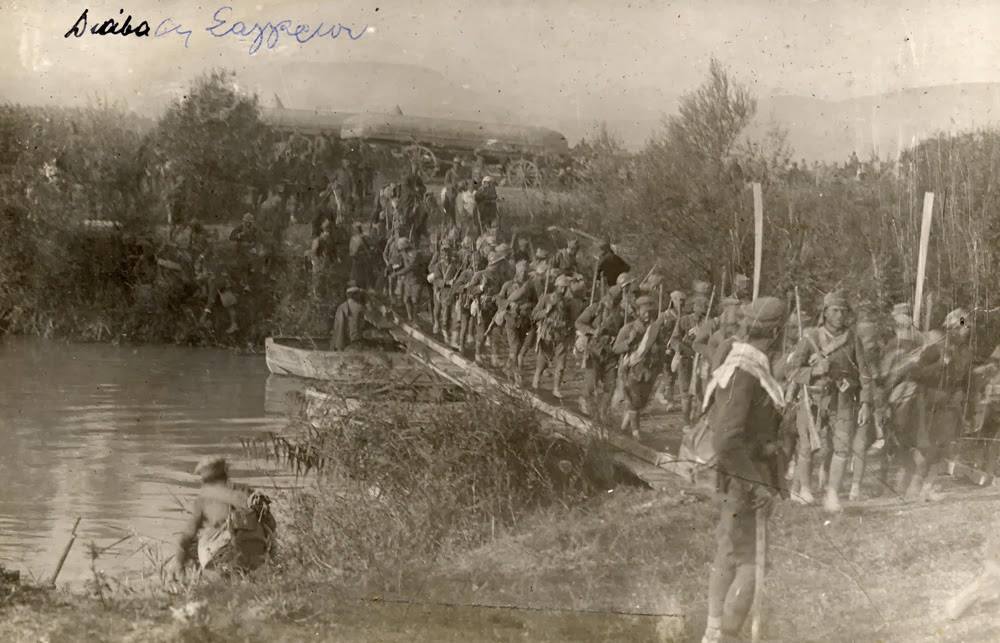 2) Γρήγορο κτίσιμο λεμβόζευκτης γέφυρας απ' το μηχανικό για διαπεραίωση στρατεύματος (~1921).