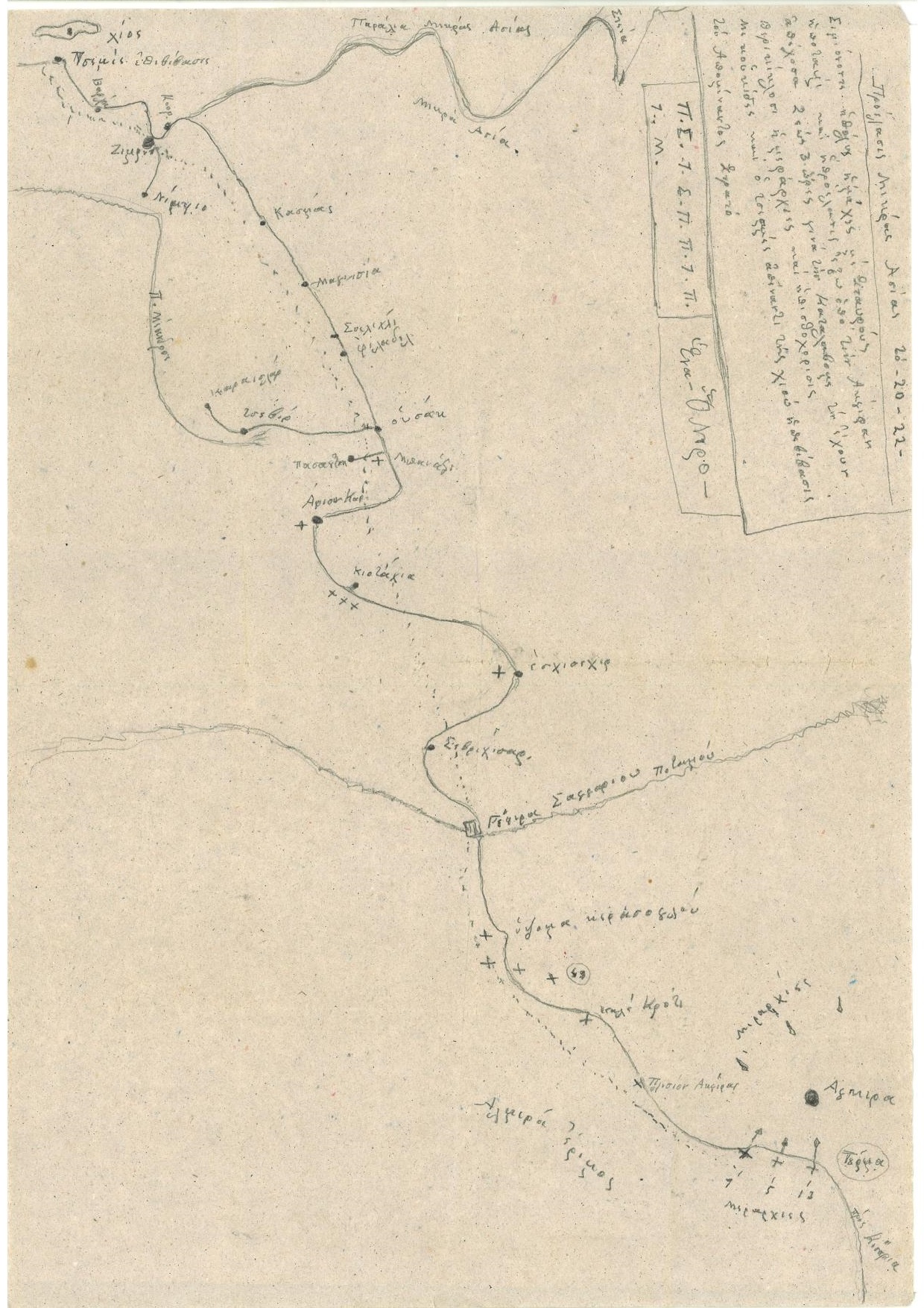 Σημειώνοντα οι πόλεις, οι μάχες με σταυρούς, οι ποταμοί και η προέλασις έξω από την Άγκυραν απέχουσα 2 έως 3 ώρες για να την καταλάβουμε, την έχουν περικυκλώσει οι μεραρχίες και η οπισθοχώρησις με κουκίδες και ο Τσεσμές απέναντι της Χίου, η επιβίβασης του Απομείναντος Στρατό.