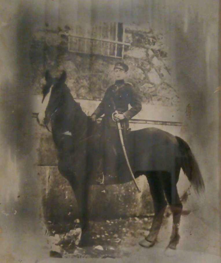Α) Ο Παναγιώτης Γ. Στρατόπουλος, έφιππος με στρατιωτική περιβολή και ξίφος, στο Γουδί (1915)