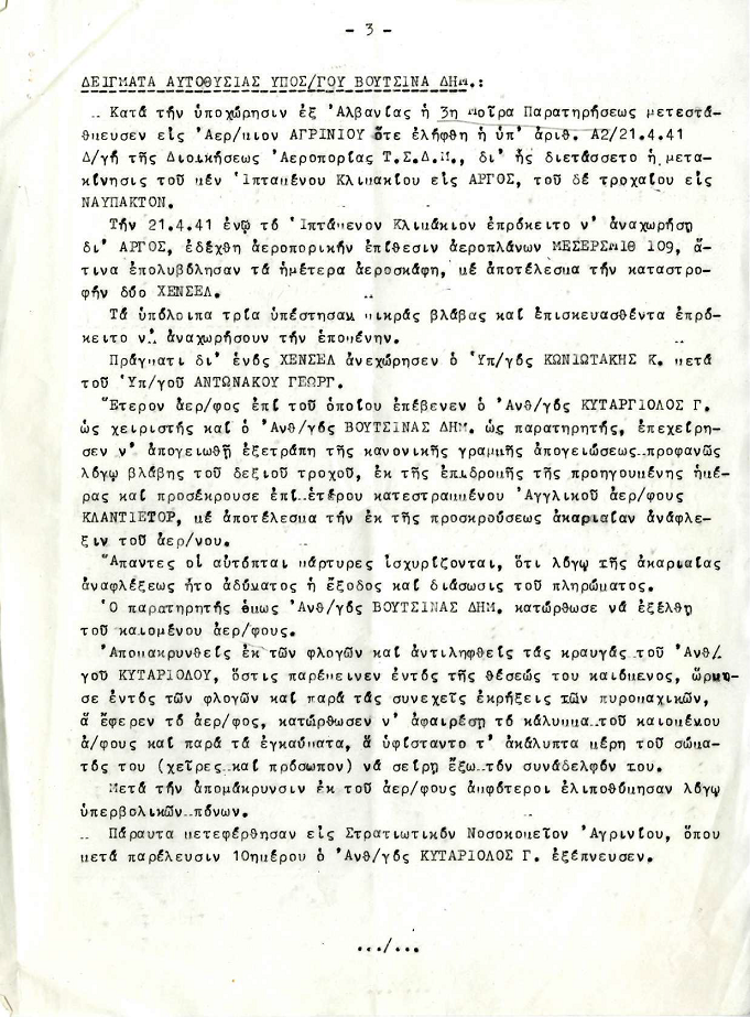 «….. Κατά την υποχώρησαν έξ Αλβανίας, ή 3η Μοίρα Παρατηρήσεως μετεστάθμευσεν εις Αεροδρόμιον Αγρινίου, ότε ελήφθη ή ύπ’ άριθ. Α2 /21 Απριλίου 1941 Δ/γή της Διοικήσεως Αεροπορίας Τ(μήματος) Σ(τρατιάς) Δ(υτικής) Μ(ακεδονίας), δι’ ης διετάσσετο η μετακίνησις, του μεν ιπταμένου κλιμακίου εις Άργος, του δε τροχαίου εις Ναύπακτον.