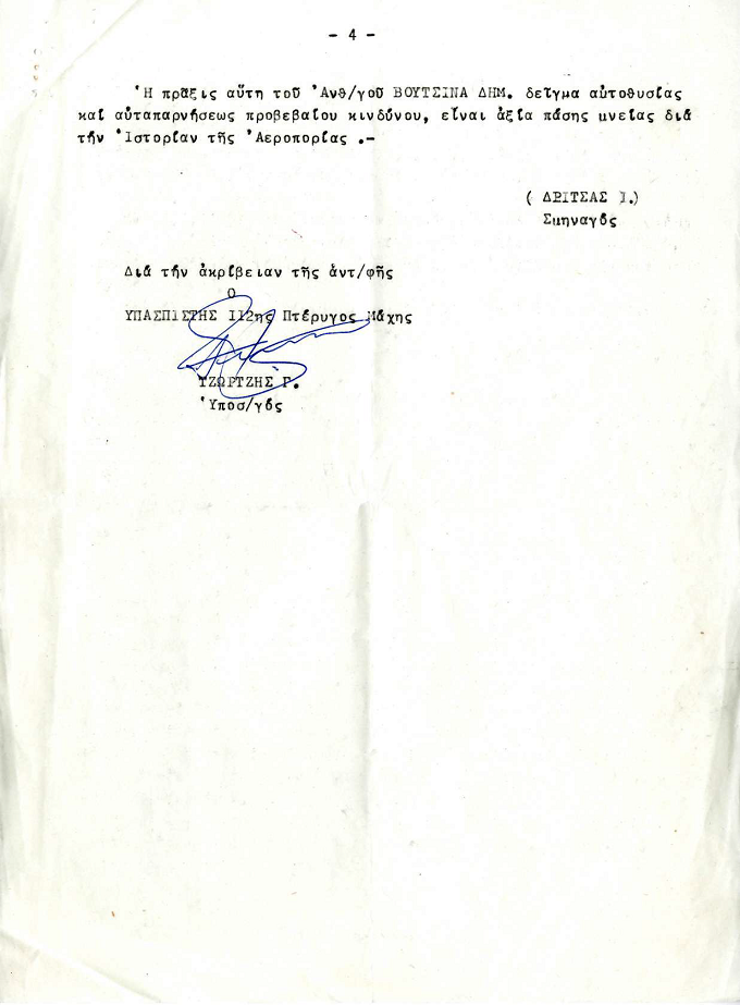 Η πράξις αύτη του Ανθυποσμηναγού ΒΟΥΤΣΙΝΑ ΔΗΜ., δείγμα αυτοθυσίας και αυταπαρνήσεως προ βεβαίου κινδύνου, είναι αξία πάσης μνείας δια την ιστορίαν της Αεροπορίας.