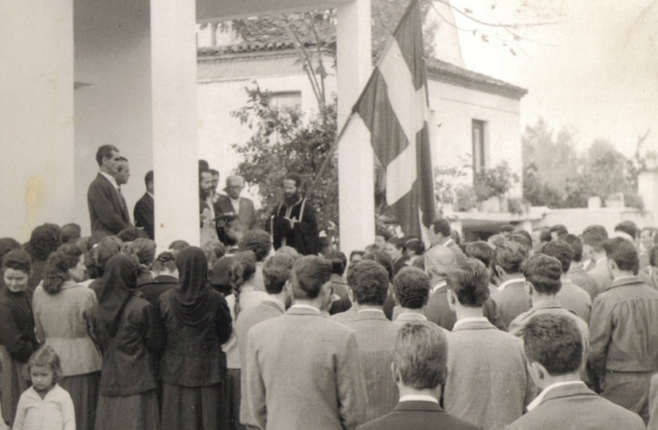 Στην δεύτερη φωτογραφία αρχείου (16/10/1958), ο Πρωτοσύγκελος Καλλίνικος Πούλος, διακρίνεται να τελεί μαζί με τον Εφημέριο του Ναού Αγίου Νικολάου, παπα Γρηγόρη Πρώϊμο, τον αγιασμό στα εγκαίνια του νέου Κοινοτικού Καταστήματος Καλυβίων, παρουσία τοπικών αρχών, επισήμων και πλήθους κόσμου.