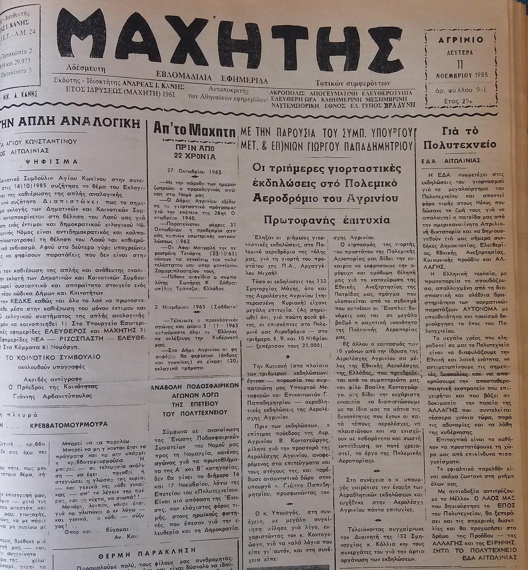 Η εφημερίδα ΜΑΧΗΤΗΣ Αγρινίου, στο φύλλο που κυκλοφόρησε την Δευτέρα 11 Νοεμβρίου 1985 έγραφε μεταξύ άλλων:
