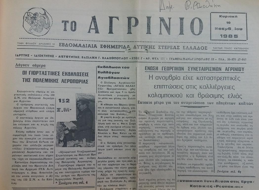 Η εφημερίδα ¨ΤΟ ΑΓΡΙΝΙΟ¨ την Κυριακή 10/11/1985 έγραφε: