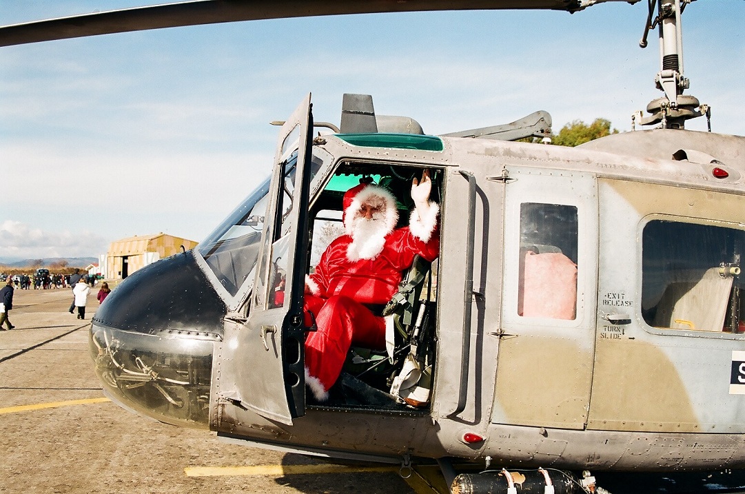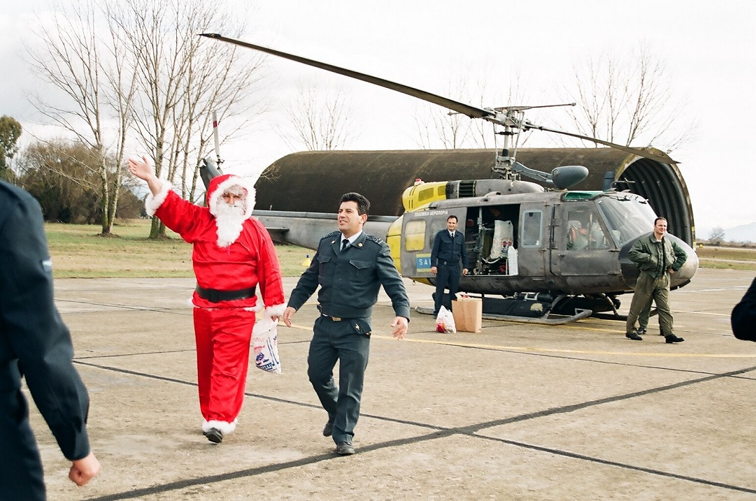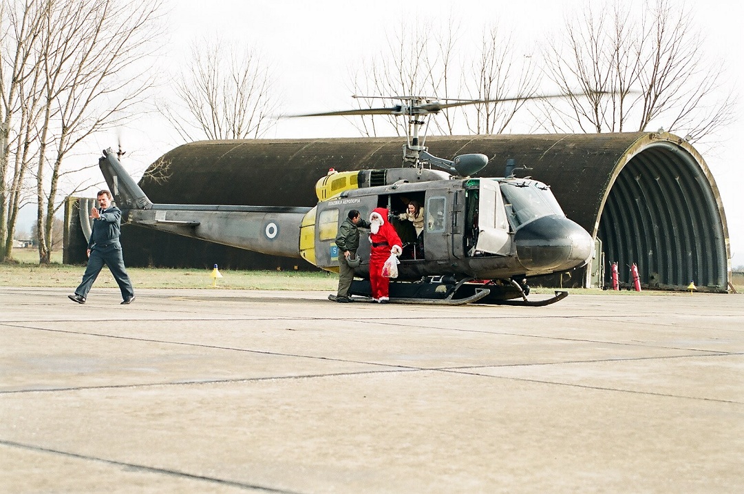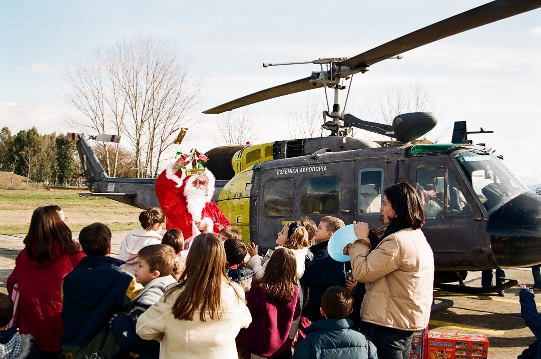 «Ο Αη Βασίλης καταφθάνει με το αεροναυαγοσωστικό ΑΒ205, της 358 Μοίρας Έρευνας Διάσωσης, που βρίσκεται σε επιφυλακή στην 116 Πτέρυγας Μάχης, στον Άραξο! Το ελικόπτερο είναι το 4445, σχετικά πρόσφατα (για τότε!) παραχωρηθέν από την Αεροπορία Στρατού.