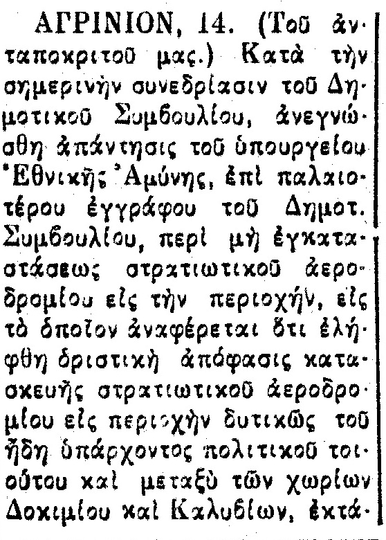 ΑΓΡΙΝΙΟΝ, 14. (Toυ ανταποκριτού μας.) Κατά την σημερινήν συνεδρίασιν του Δημοτικού Συμβουλίου, ανεγνώσθη απάντησις του υπουργείου Εθνικής Αμύνης, επί παλαιοτέρου εγγράφου του Δημοτ.Συμβουλίου, περί μη εγκαταστάσεως στρατιωτικού αεροδρομίου εις την περιοχήν, εις το οποίον αναφέρεται ότι ελήφθη οριστική απόφασις κατασκευής στρατιωτικού αεροδρομίου εις περιοχήν δυτικώς του ήδη υπάρχοντος πολιτικού τοιούτου και μεταξύ των χωρίων Δοκιμίου και Καλυβίων, εκτάσεως 2 χιλ. στρεμμάτων. Το έργον έχει προγραμματισθή και η μελέτη είναι ήδη έτοιμη.