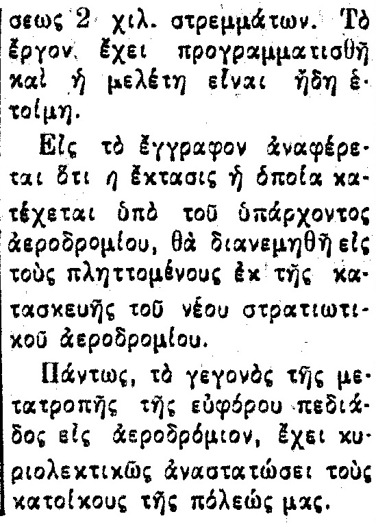 Πάντως, το γεγονός της μετατροπής της ευφόρου πεδιάδας εις αεροδρόμιον, έχει κυριολεκτικώς αναστατώσει τους κατοίκους της πόλεώς μας».