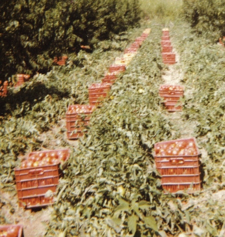 Ολημερίς οι εργάτες σκυφτοί στα γόνατα, μάζευαν τις κόκκινες ντομάτες με τους κουβάδες και κατόπιν τις έριχναν στα πλαστικά κιβώτια, τις ¨κλούβες¨, τα ρούχα και τα χέρια ¨πρασίνιζαν¨ από τα φυτά, όμως κανείς δεν διαμαρτύρονταν και με καρτερική υπομονή γέμιζαν με τις κλούβες τις αυλακιές.