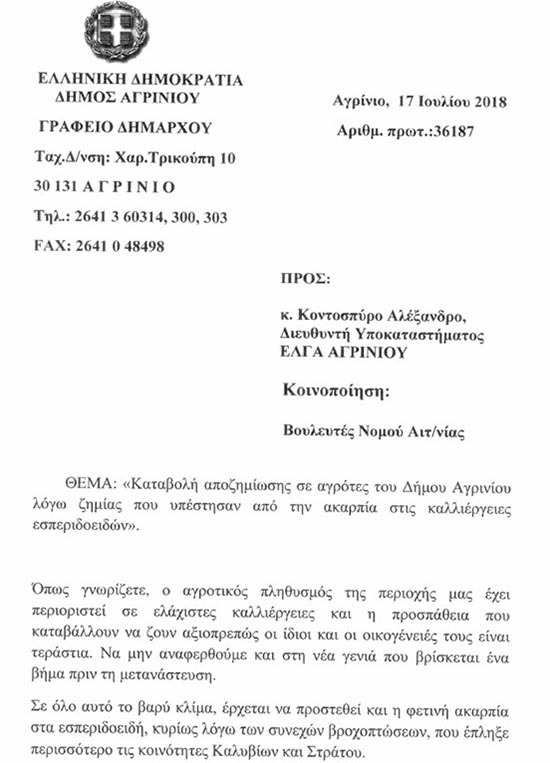 ΘΕΜΑ: «Καταβολή αποζημίωσης σε αγρότες του Δήμου Αγρινίου λόγω ζημίας που υπέστησαν από την ακαρπία στις καλλιέργειες εσπεριδοειδών».