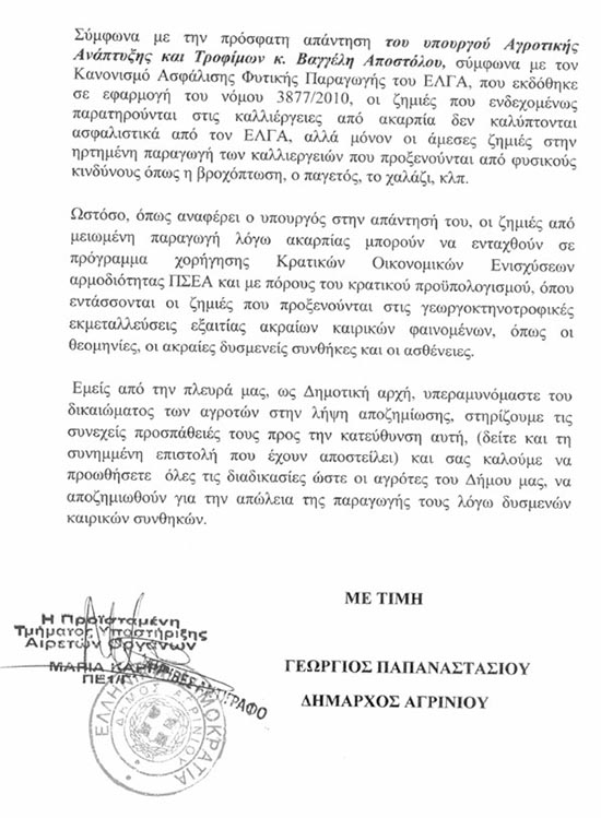 Εμείς από την πλευρά μας ως Δημοτική αρχή, υπεραμυνόμαστε του δικαιώματος των αγροτών στην λήψη αποζημίωσης, στηρίζουμε τις συνεχείς προσπάθειες τους προς την κατεύθυνση αυτή, (δείτε και τη συνημμένη επιστολή που έχουν αποστείλει) και σας καλούμε να προωθήσετε όλες τις διαδικασίες ώστε οι αγρότες του Δήμου μας, να αποζημιωθούν για την απώλεια της παραγωγής τους λόγω δυσμενών καιρικών συνθηκών.