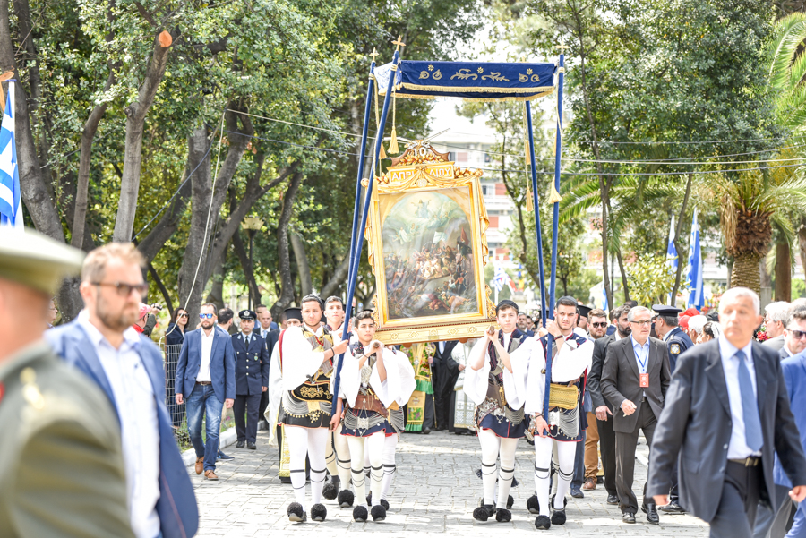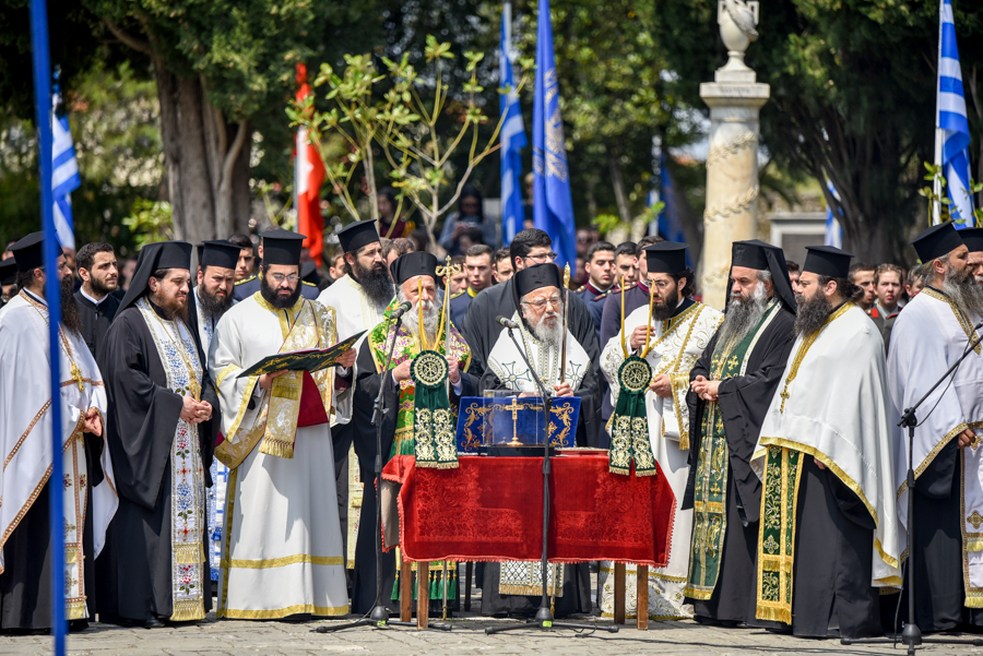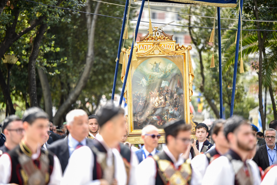 Με τις τιμές του αγήματος της Προεδρικής Φρουράς, του 2/39 Συντάγματος Ευζώνων, αλλά και των τριών Σωμάτων του Ελληνικού μας Στρατού, η Εικόνα της Εξόδου και ο Σταυρός Ευλογίας του Επισκόπου Ρωγών Ιωσήφ μεταφέρθηκαν στον Κήπο των Ηρώων της Ιεράς Πόλεως.