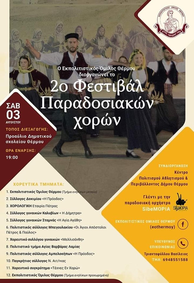 Η συγκεκριμένη εκδήλωση διοργανώνεται από τον Εκπολιτιστικό Όμιλο Θέρμου σε συνδιοργάνωση με το Κέντρο Πολιτισμού-Αθλητισμού του δήμου Θέρμου, το Σάββατο 3 Αυγούστου, στις 7.00 μ.μ. στο προαύλιο του Δημοτικού Σχολείου Θέρμου.