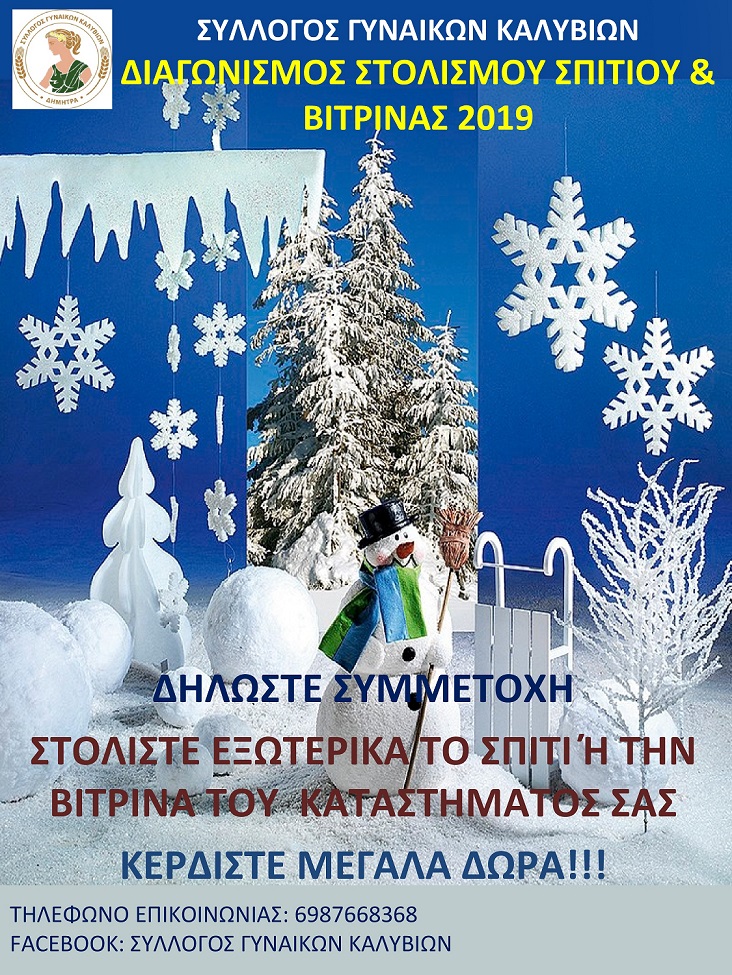 Όσοι επιθυμείτε να λάβετε μέρος στο διαγωνισμό θα πρέπει να στείλετε μήνυμα συμμετοχής και μία φωτογραφία του στολισμένου σπιτιού ή της βιτρίνας, στο Facebook, στη σελίδα του Συλλόγου Γυναικών Καλυβίων.